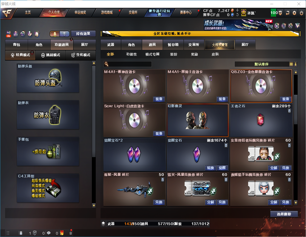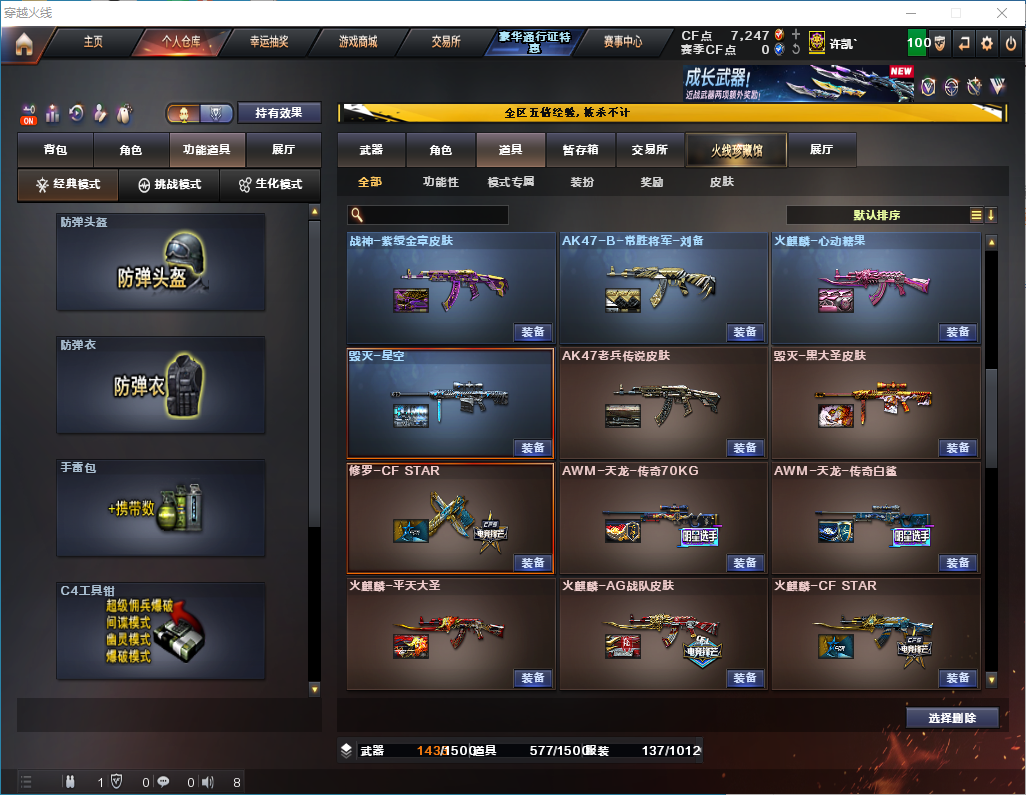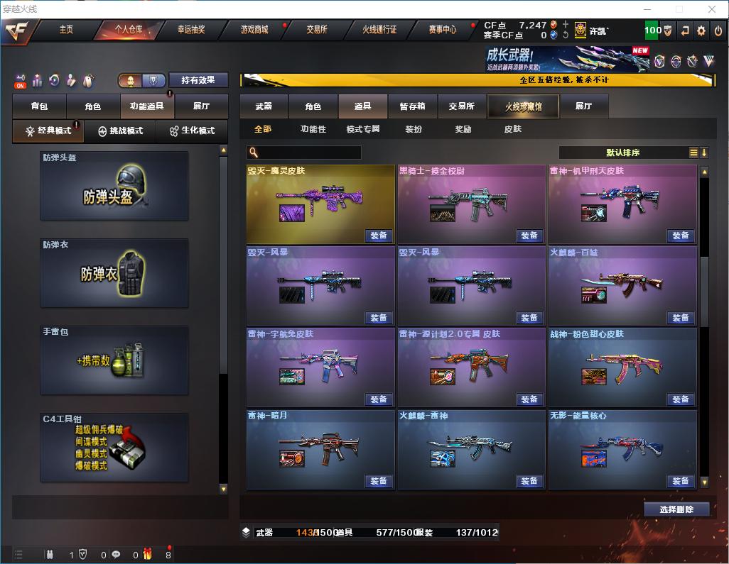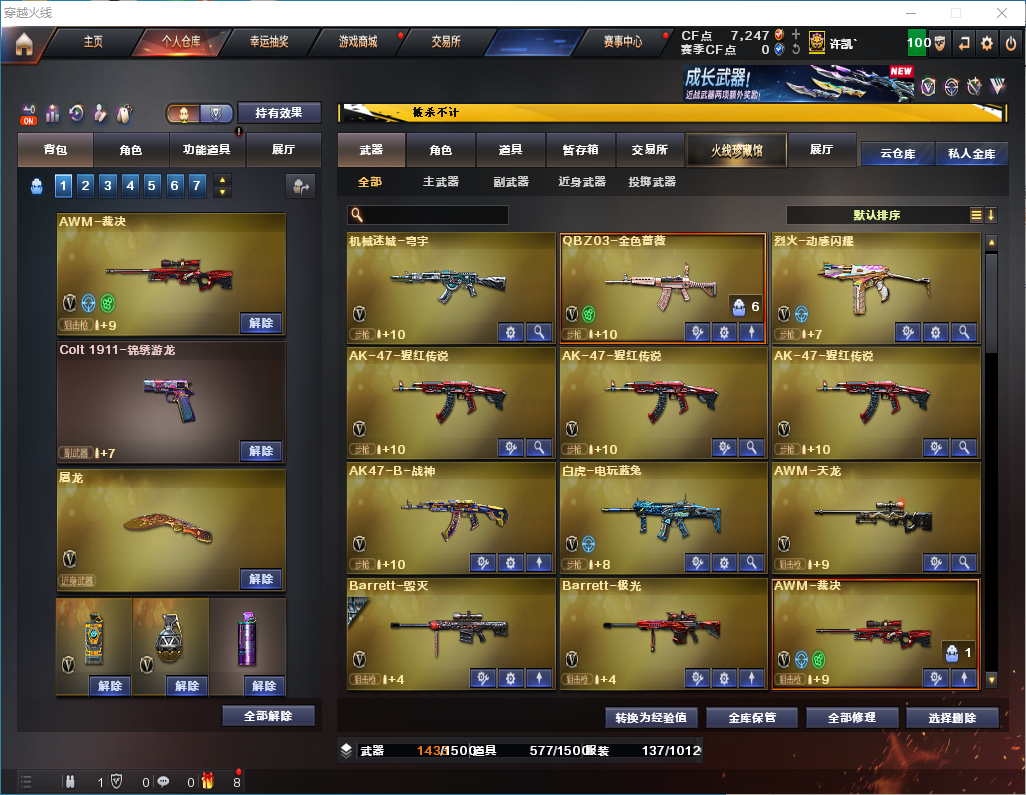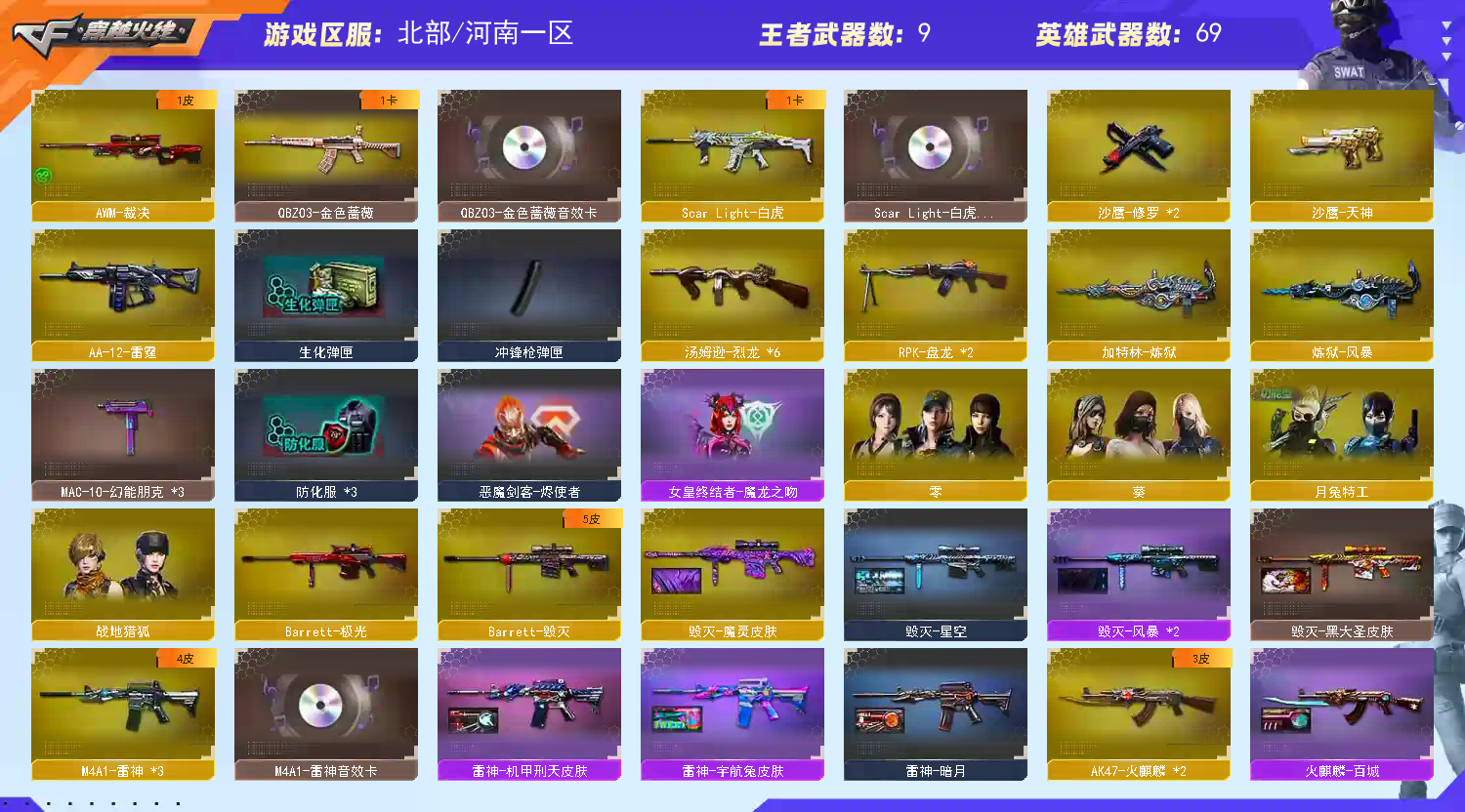 白虎+卡/QBZ金色蔷薇+卡/6烈龙+死亡之眼/【黑骑士三件套】【雷神三件套】 【步枪】火麒麟/黑龙/雷神/黑骑士/死神/黑武士/超新星/白虎/无影/神兵利器/黑武士锦绣游龙/机械迷城穹宇/QBZ金色蔷薇/烈火动感闪耀/白虎电玩蓝图/赤狱骑士/ 【狙击枪】天龙/毁灭/激光/裁决/经济荣光/大炮金色蔷薇/暗月传说/ 【机枪】盘龙/炼狱/炼狱风暴/ 【冲锋枪】烈龙x6/ 【散弹枪】AA12雷霆/ 【挑战强化武器】黑骑士/黑武士/超新星/白虎/黑武士锦绣游龙/烈火动感闪耀/白虎电玩蓝图/裁决/盘龙/炼狱/炼狱风暴/烈龙x6/ 【生化武器】死神/QBZ金色蔷薇/裁决/M200经济荣光/AA12雷霆/赤狱骑士/AWM昌龙 【手枪】修罗/天神/天神动感闪耀/ 【刀】屠龙/麒麟刺/幻灵之锋/擎天经济荣光/屠龙动感闪耀/王者之锋/龙啸烈火龙威/ 【手雷】幻灵手雷/竞技荣光手雷/动感闪耀手雷/竞技荣光闪光/云龙闪光弹/雷霆王者闪光弹/竞技荣光烟雾弹/雷霆王者手雷/雷霆王者烟雾弹/ 【角色】葵/零/月兔特工/零纪元/战地猎狐/乔伊教练/修道士/ 【卡】雷神卡/黑骑士卡/QBZ金色蔷薇卡/白虎卡/ 【皮肤】毁灭魔灵/黑骑士摸金校尉/雷神机甲刑天/毁灭风暴/火麒麟白城/雷神宇航兔/雷神源计划/毁灭星空/毁灭黑大圣/火麒麟AG/雷神神秘按键/毁灭英雄计划/;RPK-盘龙,QBZ03-金色蔷薇,Scar Light-白虎,