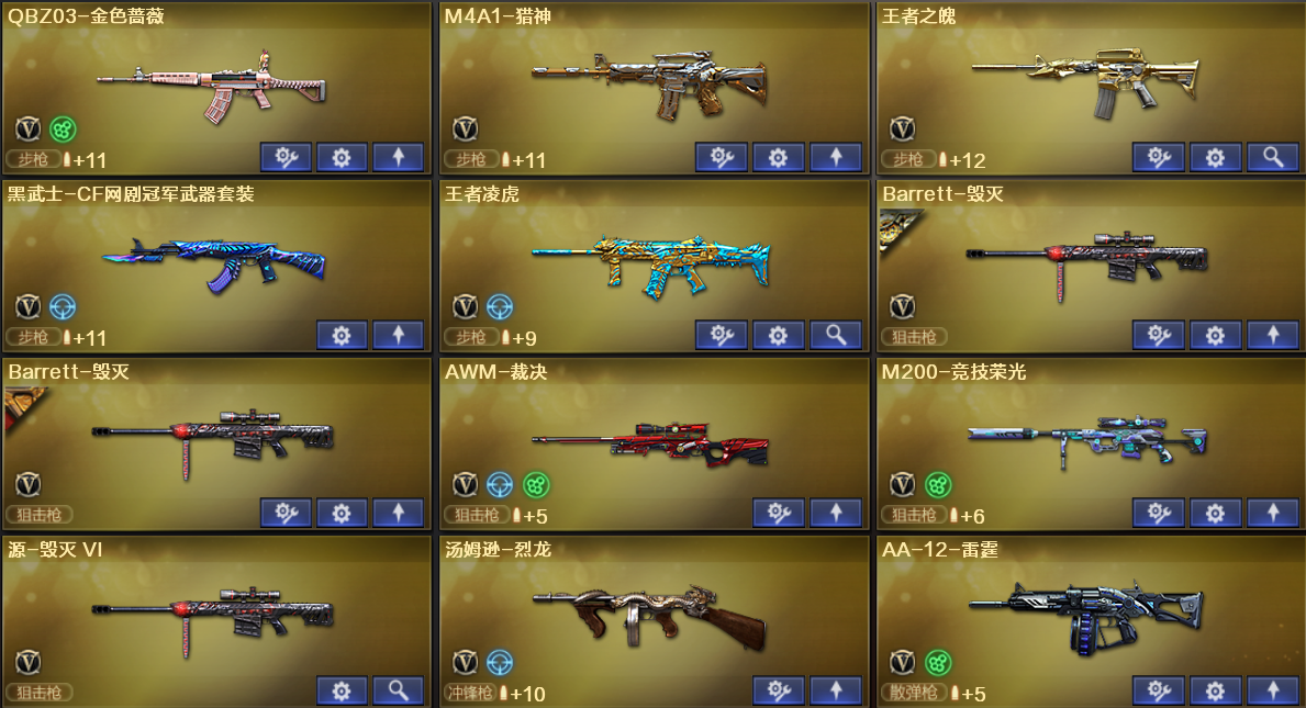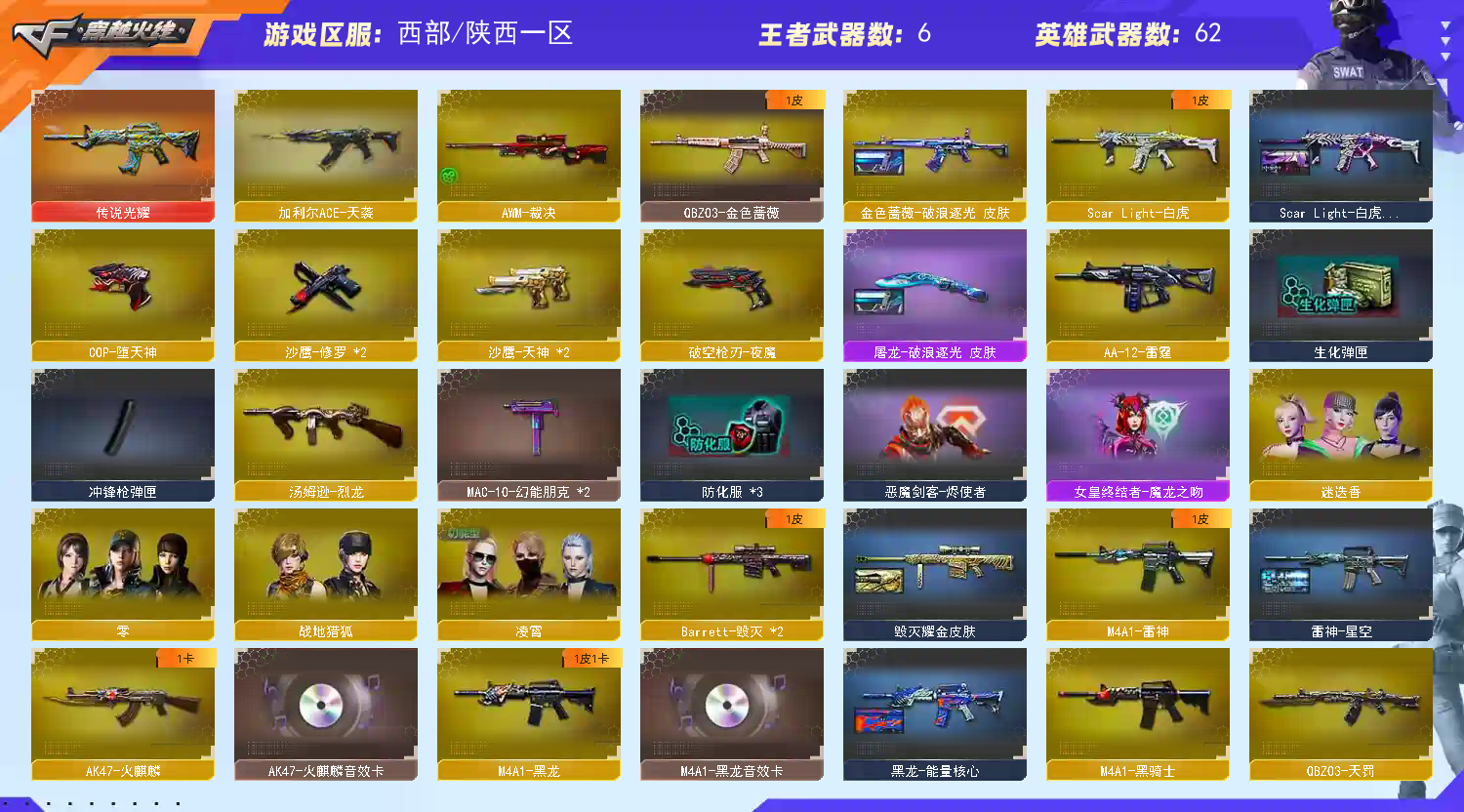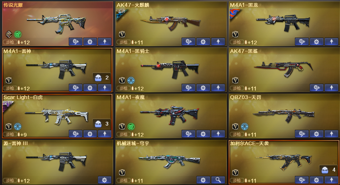 西部陕西一区64V/加利尔天玺/幻神竞技荣光/传说光耀/觉醒王者凌虎/白虎/QBZ;QBZ03-金色蔷薇,Scar Light-白虎,加利尔ACE-天袭,