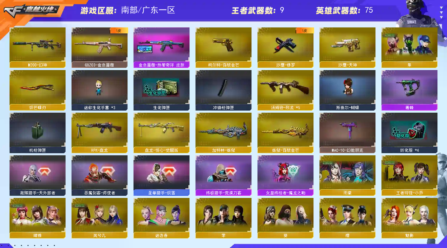 可以排位 77v 9王者 炽芒蝶刃隼六烈蝴蝶 炼狱两盘 幻神 M4A1神工天巧 HK417朱雀电竞之星 白虎电玩蓝兔 天罚斗烈龙驹 金色蔷薇qbz 觉醒王者之魄 觉醒王者之城 觉醒王者之魂 usp雷暴深海特遣队 柯尔特百战金芒 修罗斗烈龙驹 隼、晴雅、雨棠已开四槽,其余英雄角色都是三防,王者零华冠丽服、王者玲珑小乔已开四槽。 晴雅 岚兮儿 机械姬 迷迭香 魅影 空 甜心偶像王者瞳闭月羞花 生化有蝴蝶毒蜂六烈两炼狱(一炼狱一金芒炼狱)两盘蝴蝶刀四槽隼全幽灵 迷你生化手雷×2 手斧镜 挑战 甄选次元套 5致命一击 火狱超越max aa12擎天柱 神圣爆裂者 试炼破坏者III 道具描述不完,账号具体内容可看图片介绍。;炽芒蝶刃,隼,晴雅,RPK-盘龙,QBZ03-金色蔷薇,M200-幻神,