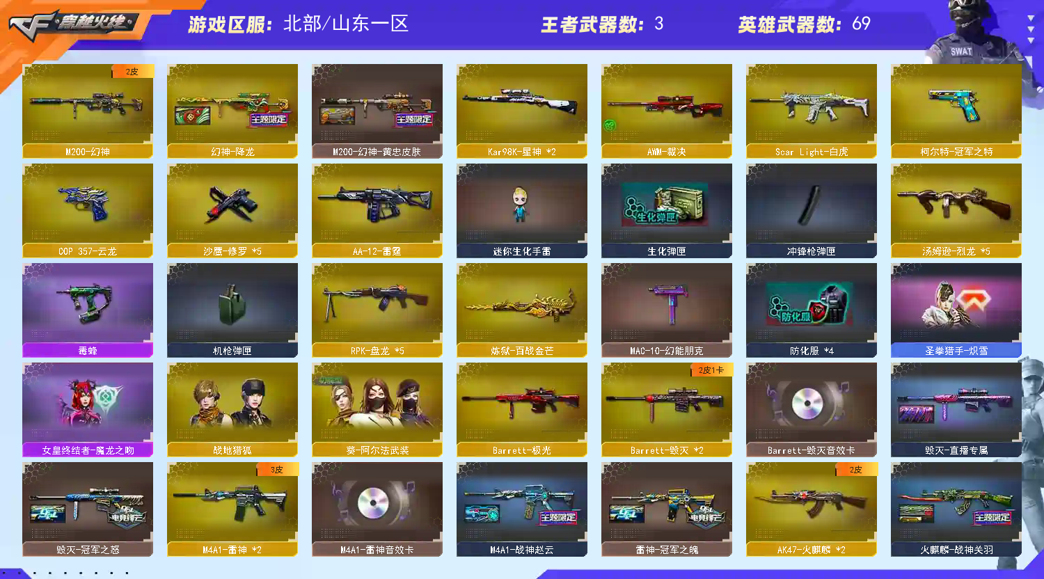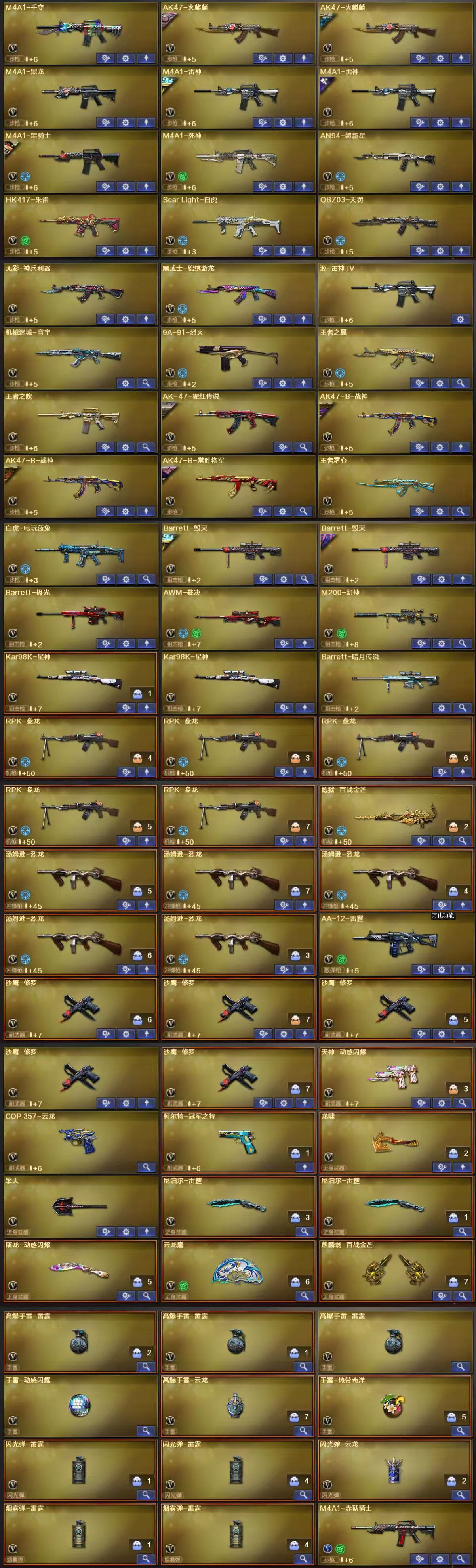 挂机中途退出永久冻结账户!!!祝您游戏愉快!!!生活愉快!!!;柯尔特-冠军之特,RPK-盘龙,M200-幻神,Scar Light-白虎,Kar98K-星神,