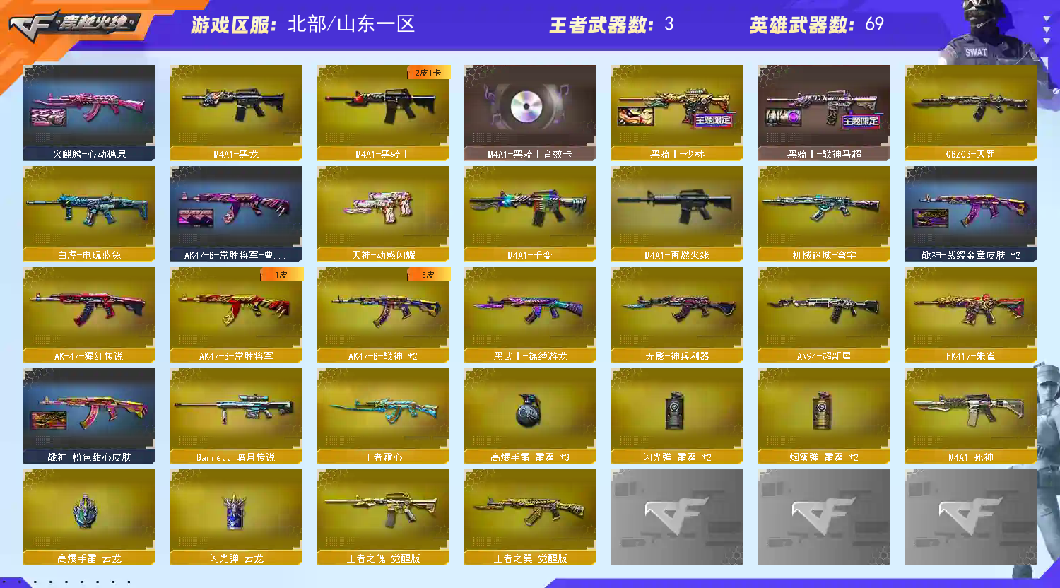 首页 > 租号大厅 > 穿越火线 > 北部/山东一区 > 挂机拉黑⭐热门主武器齐全⭐副武器齐全⭐六烈六盘毒蜂死亡之眼炼狱百战金芒⭐4音效卡⭐幻神星神等