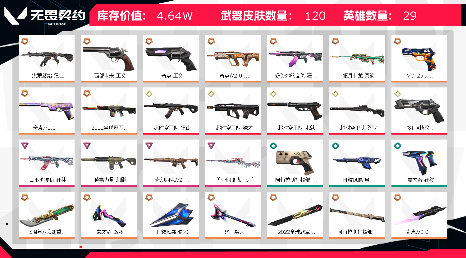 可排位,主战皮肤齐全;5周年//公测重制版 苍龙之刃,盖亚的复仇 狂徒,洪荒怒焰 狂徒,侦察力量 幻影,西部未来 正义,奇点 正义,