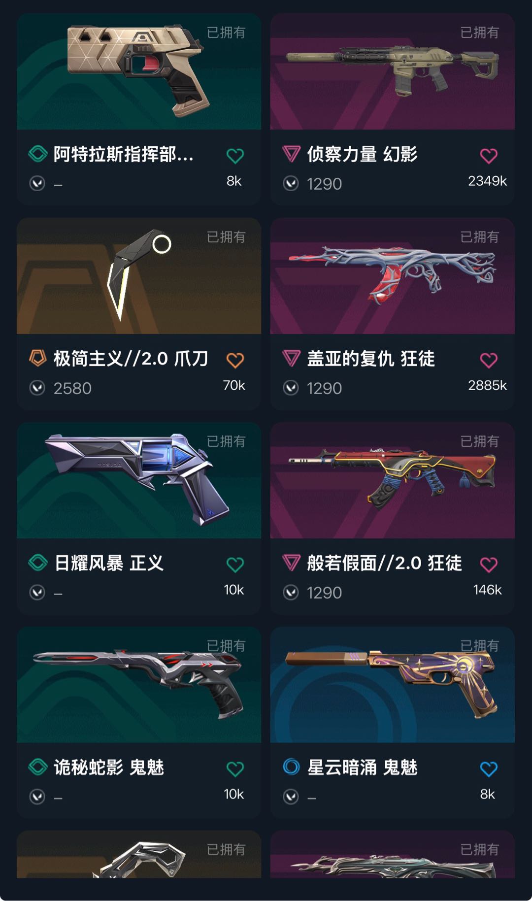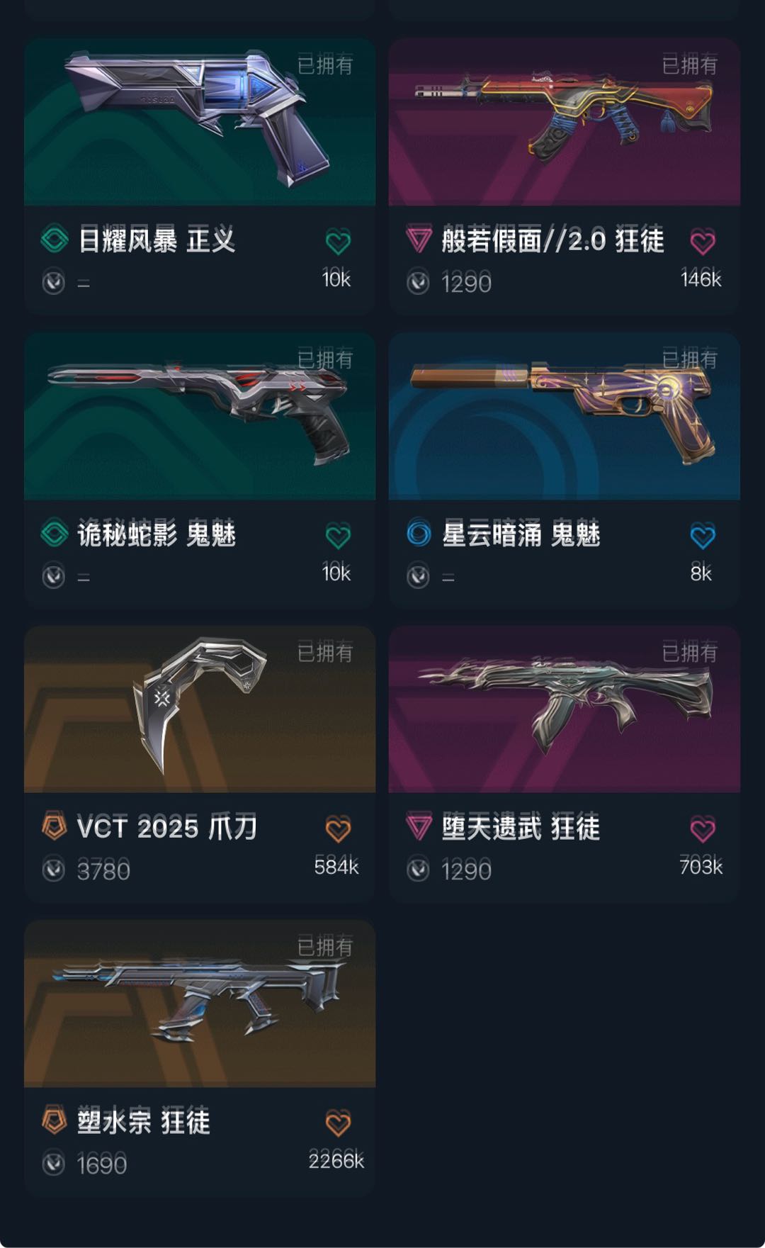 允许 英雄28 武器皮肤数量13;VCT 2025 爪刀,盖亚的复仇 狂徒,侦察力量 幻影,堕天遗武 狂徒,塑水宗 狂徒,