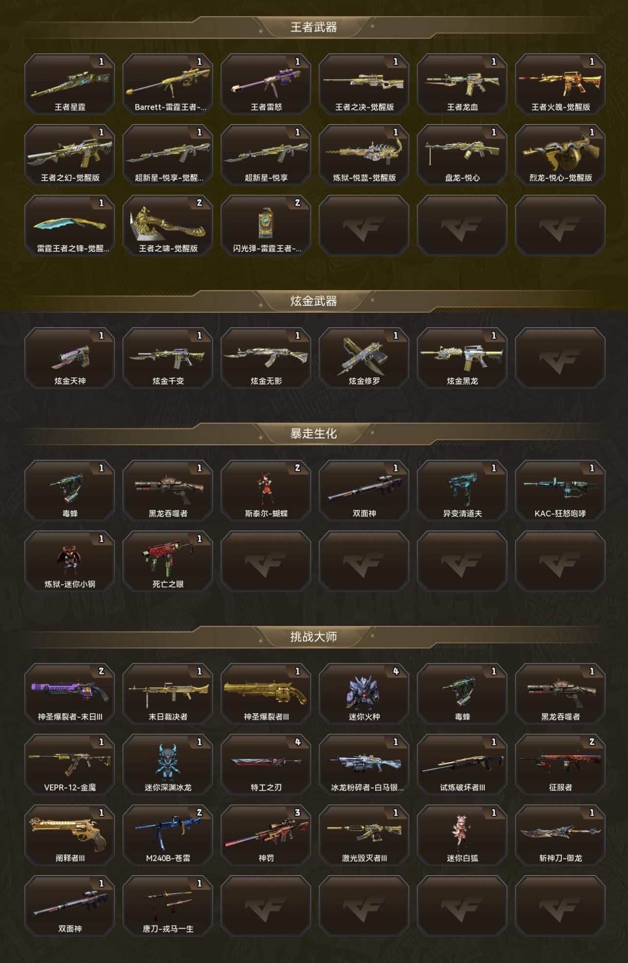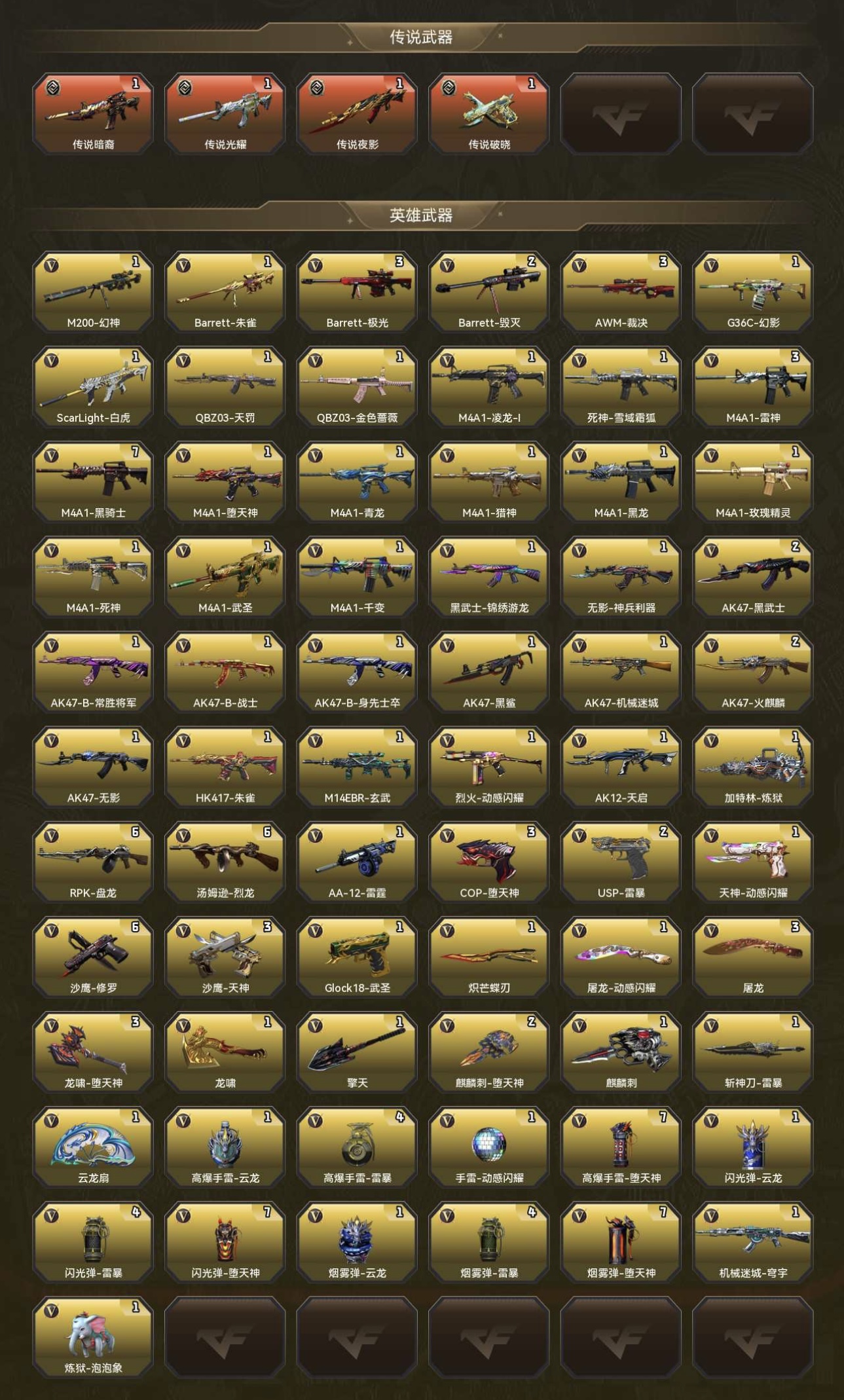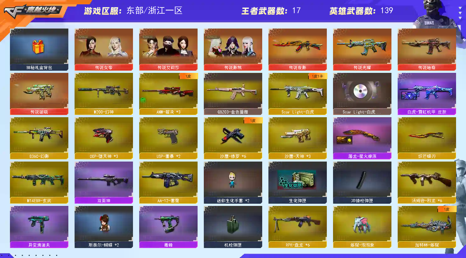 VIP6 144V7传说21王者5炫金6烈6盘炼狱泡泡象毒蜂USP雷暴幻神传说武器4传说暗裔传说光耀