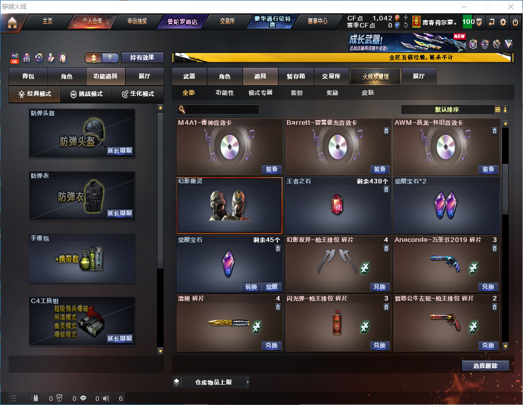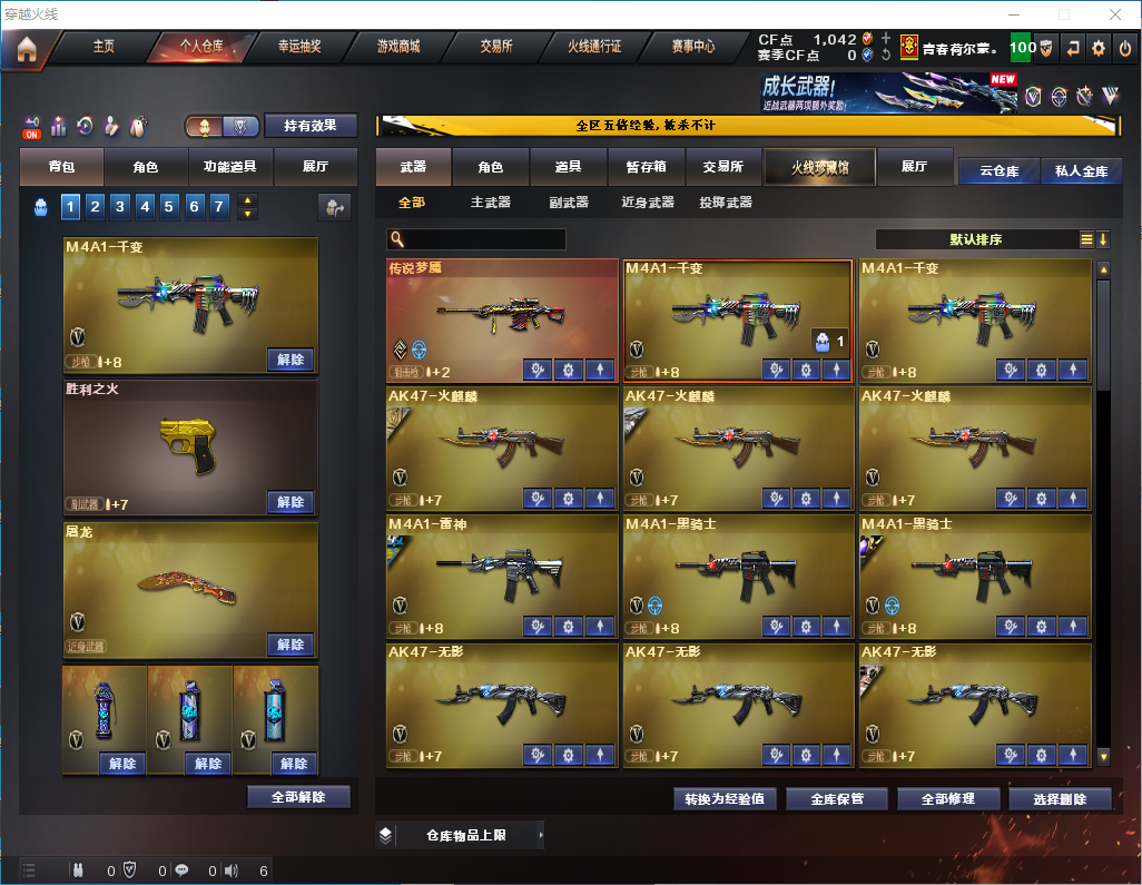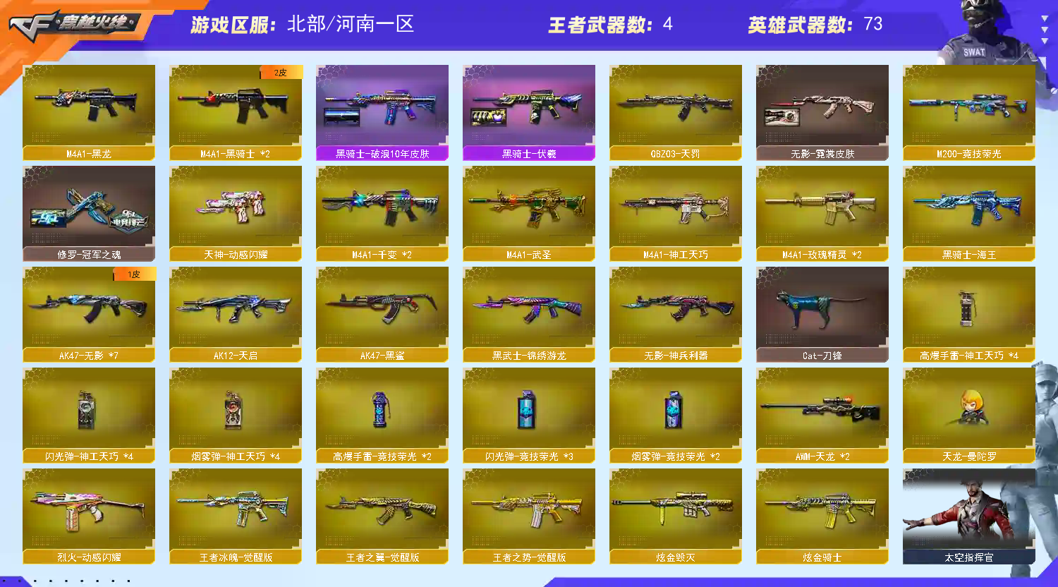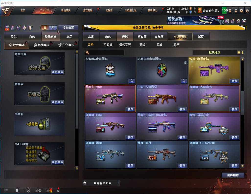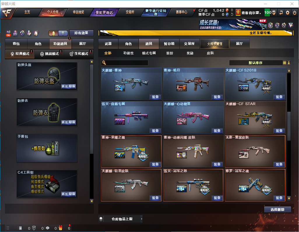 传说梦魇【雷神三件套】神功天巧/星神/裁决/M200经济荣光/神功天巧套 【步枪】千变/火麒麟/雷神/黑骑士/无影/无影/黑鲨/天启/武圣/黑鲨/天罚/神功天巧/无影神功利器/黑武士锦绣游龙/玫瑰精灵/烈火/烈虎动感闪耀/王者之势/王者冰魄/黑骑士海王 【狙击枪】传说梦魇/天龙/毁灭/裁决/星神/经济荣光/裁决白城联赛/ 【机枪】炼狱 【冲锋枪】 【散弹枪】 【挑战强化武器】传说梦魇/黑骑士/天罚/黑武士/锦绣游龙/玫瑰精灵/烈火/王者之势/裁决/炼狱/ 【生化武器】裁决/M200经济荣光 【手枪】修罗/武圣/柯尔特经济荣光/神功天巧/COP白鲨/ 【刀】屠龙/龙啸/麒麟刺/擎天经济荣光/唐刀神功天巧/屠龙动感闪耀/ 【手雷】经济荣光手雷套/神功天巧手雷套/ 【角色】云悠悠/葵/清雅/樱/零纪元/战地猎狐/乔伊教练/修道士 【卡】雷神卡 【皮肤】毁灭魔灵/黑骑士伏羲/白虎大汉风骨/火麒麟大唐荣光/火麒麟白城/黑骑士破浪10年/擎天冠军之击/火麒麟雷神/雷神荣耀之魄/雷神动感闪耀/火麒麟轻羽/毁灭冠军之怒;电竞教官-云悠悠,晴雅,Kar98K-星神,