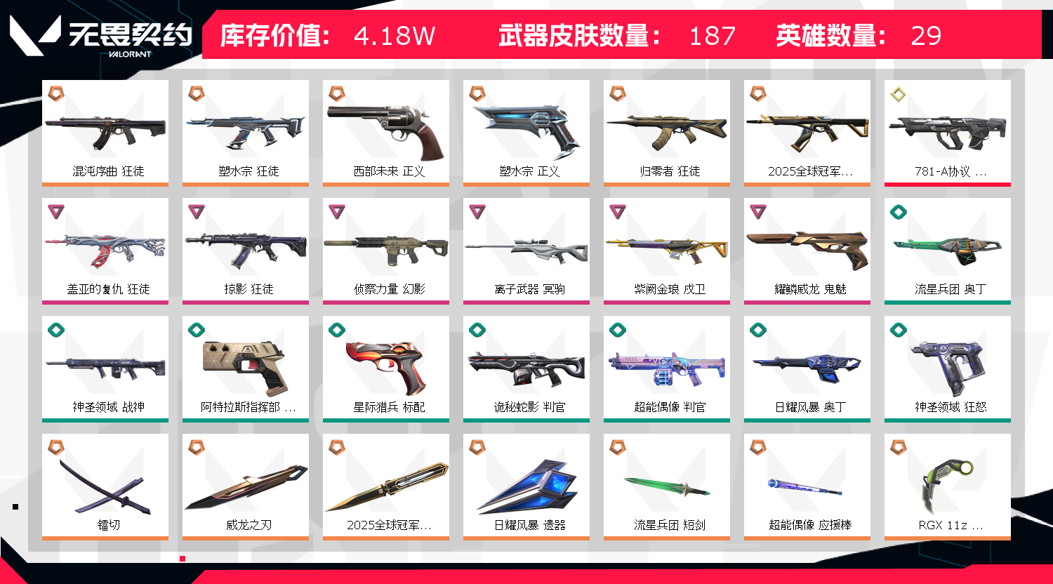25冠军套,显卡爪刀,奇点蝴蝶,镭切,主战若干T0皮肤。 因无畏契约检测严格,为防止后台插件导致封号,请务必重启电脑。 老板请不要杀太多,容易冻结。 禁止在游戏内使用外挂,脚本,挂机,恶意发言,游戏内诱导诈骗等违规行为,若出现账号封禁/毁号等情况,会马上与平台联系,平台会报警处理!请租客文明游戏。 祝老板玩的愉快,开挂必追究,不拿到赔偿不罢休!如果上号正在游戏中,是上个租客到时不下线导致的,不是号主在玩,请帮忙打完这局,谢谢了,为了防止顶号,请您及时续租获得更好的游戏体验。;镭切,威龙之刃,盖亚的复仇 狂徒,掠影 狂徒,侦察力量 幻影,混沌序曲 狂徒,塑水宗 狂徒,