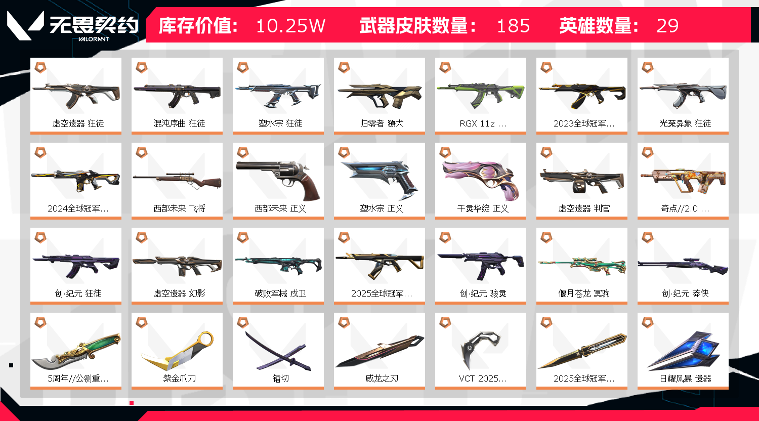 首页 > 租号大厅 > 无畏契约-wegame > wegame/wegame > 10w+库 26篆刀 25爪刀 25 24冠军套 23冠军狂徒 艾沃利奥丁 虚空遗器全套 EDG标配
