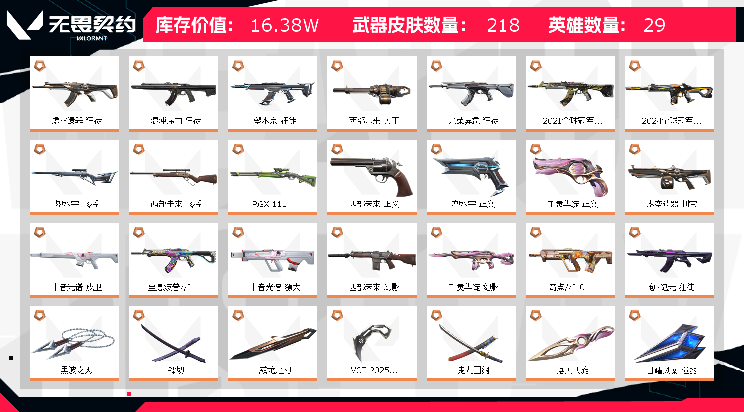 16.5w库存⚡️2200r点⚡️21冠军套⚡️24冠军套⚡️22冠军套⚡️神话挂饰⚡️牛牛挂饰⚡️塑水套⚡️电玩套⚡️电音光谱套⚡️创纪元套⚡️西部套⚡️虚无套;西部未来 奥丁,黑波之刃,镭切,威龙之刃,VCT 2025 爪刀,盖亚的复仇 狂徒,虚空遗器 狂徒,