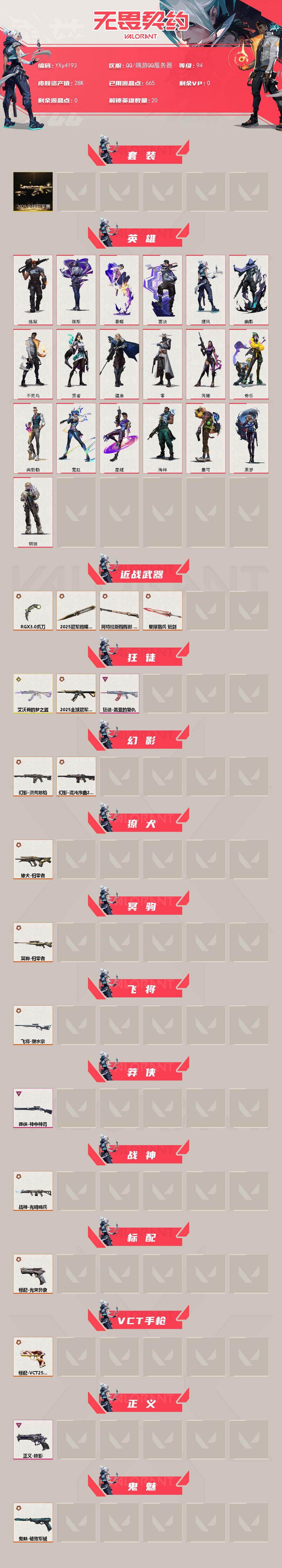 冻结三分钟内解除,短信通知重新上即可!喜欢收藏不迷路、游戏异常进小黑屋、时间不够请提前续租或者不要开局 【套装】:2025全球冠军赛套装 【英雄】:炼狱,维斯,暮蝶,壹决,捷风,幽影,不死鸟,贤者,猎枭,零,芮娜,奇乐,尚勃勒,霓虹,星礈,海神,盖可,黑梦,钢锁 【近战武器】:近战武器-2025全球冠军赛 蝴蝶刀,近战武器-RGX 11z Pro//3.0 爪刀,近战武器-阿特拉斯指挥部 甩棍,近战武器-星际猎兵 短剑 【狂徒】:狂徒-艾沃莉的梦之翼,狂徒-2025全球冠军赛,狂徒-盖亚的复仇 【幻影】:幻影-洪荒怒焰,幻影-混沌序曲//2.0 【獠犬】:獠犬-归零者 【冥驹】:冥驹-归零者 【飞将】:飞将-塑水宗 【莽侠】:莽侠-神中神罚 【战神】:战神-光明哨兵 【标配】:标配-光荣异象 【VCT手枪】:标配-VCT25 x EDG 【正义】:正义-掠影 【鬼魅】:鬼魅-破败军械 【卡面】:《双城之战》拥抱 卡面,精灵大战 卡面,欢迎来到底城 卡面,南瓜盛典 卡面,修车达人 卡面,正义的化身 卡面,无畏契约GO!一卷:芮娜 卡面,无畏契约GO!一卷:零 卡面,《双城之战》金克丝
