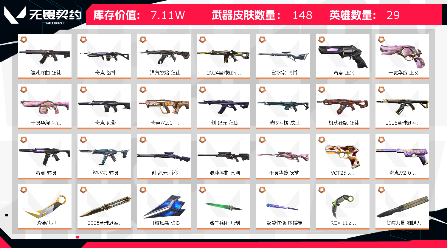 首页 > 租号大厅 > 无畏契约-wegame > wegame/wegame > 选氪25冠军套14刀✨显卡紫金爪25冠军侦查奇点蝴蝶刀✨24冠军侦查盖亚混沌奇点洪荒紫阙掠影艾沃莉皮