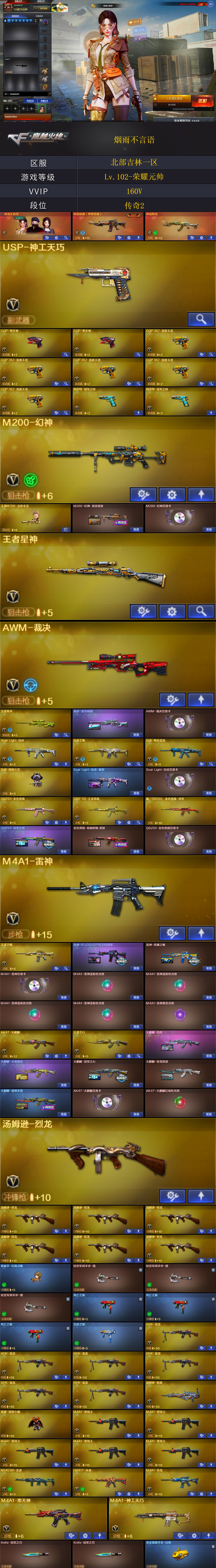 【商品标题】:北部吉林一区-160V-可二次实名-【Lv.102-荣耀元帅】-【段位:传奇2】 【稀有武器】:传说辉光/M200-幻神/ScarLight-白虎/M14EBR-玄武/M4A1-青龙/HK417-朱雀/M4A1-神工天巧/M4A1-堕天神/COP-堕天神(2)/USP-神工天巧/修罗-古蛇迷踪/COP357-雷霆王者-觉醒版(5)/柯尔特-冠军之特(2)/金色蔷薇-古蛇迷踪/QBZ03-金色蔷薇(4)/AK47-火麒麟(3)/M4A1-黑龙/M4A1-雷神(4)/M4A1-黑骑士(5)/AK47-无影/AK47-黑武士(2)/白虎-电玩蓝兔/Barrett-毁灭(3)/Barrett-极光(2)/AWM-裁决/RPK-盘龙(6)/加特林-炼狱/汤姆逊-烈龙(7)/AA-12-雷霆/麒麟刺-堕天神(2)/龙啸-堕天神/唐刀-神工天巧 【王者武器】:王者之心-觉醒版/王者之魄-觉醒版/M4A1-雷霆王者-觉醒版/QBZ-03-王者蔷薇-觉醒版/白虎之魄-觉醒版/王者星神-觉醒版/王者森决-觉醒版/王者之怒/王者之光 【热门角色】:传说艾莉莎/荒漠琉璃/迷迭香/枪娘樱/炫/蛇隐宗/王者-葵-貂蝉/王者玲珑-小乔/王者潘多拉/王者涂鸦/新海豹突击队/潘多拉-X/兔囡囡/幽/职业选手/潘多拉 【热门音效卡】:M200-幻神音效卡/AWM-裁决音效卡/Scar Light-白虎音效卡/QBZ03-金色蔷薇音效卡/M4A1-雷神音效卡/Barrett-毁灭音效卡/M4A1-黑骑士音效卡(2)/AK47-火麒麟音效卡/M4A1-黑龙音效卡 【热门皮肤】:火麒麟-白虎/雷神-R.LGD-CFPLS18冠军/擎天-冠军之击/QBZ03-冠军之薇/死神-机甲核心皮肤/裁决-流光秘银/黑龙-冠军之武/火麒麟-大唐荣光/火麒麟-战神关羽/毁灭-战神张飞/M4A1-战神赵云/黑骑士-战神马超/ScarLight-白虎-暗星/火麒麟-冠军之心/屠龙-荣耀之锋(2)/金色蔷薇-枪娘阿敏皮肤/毁灭-荣耀之怒/龙啸-冠军之啸/雷神-荣耀之魄 【其他亮点】:炼狱-迷你小钢/Knife-冠军之刃(2)/白虎-迷你小艾/王者M200-无畏金戈/贝雷塔687-射手座/黄金猫猫手套-白鲨/金刚伞-电玩红兔 (截图展示段位不代表实际段位,如赛季更新等不可抗拒因素发生变化,其余道具看截图或咨询客服);柯尔特-冠军之特,Knife-冠军之刃,传说艾莉莎,RPK-盘龙,QBZ03-金色蔷薇,M200-幻神,Scar Light-白虎,