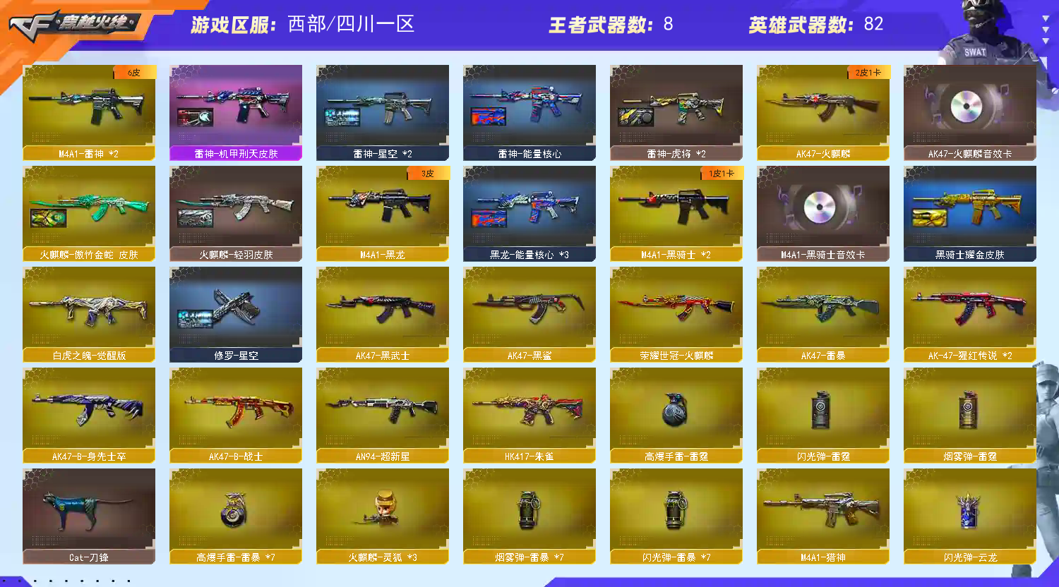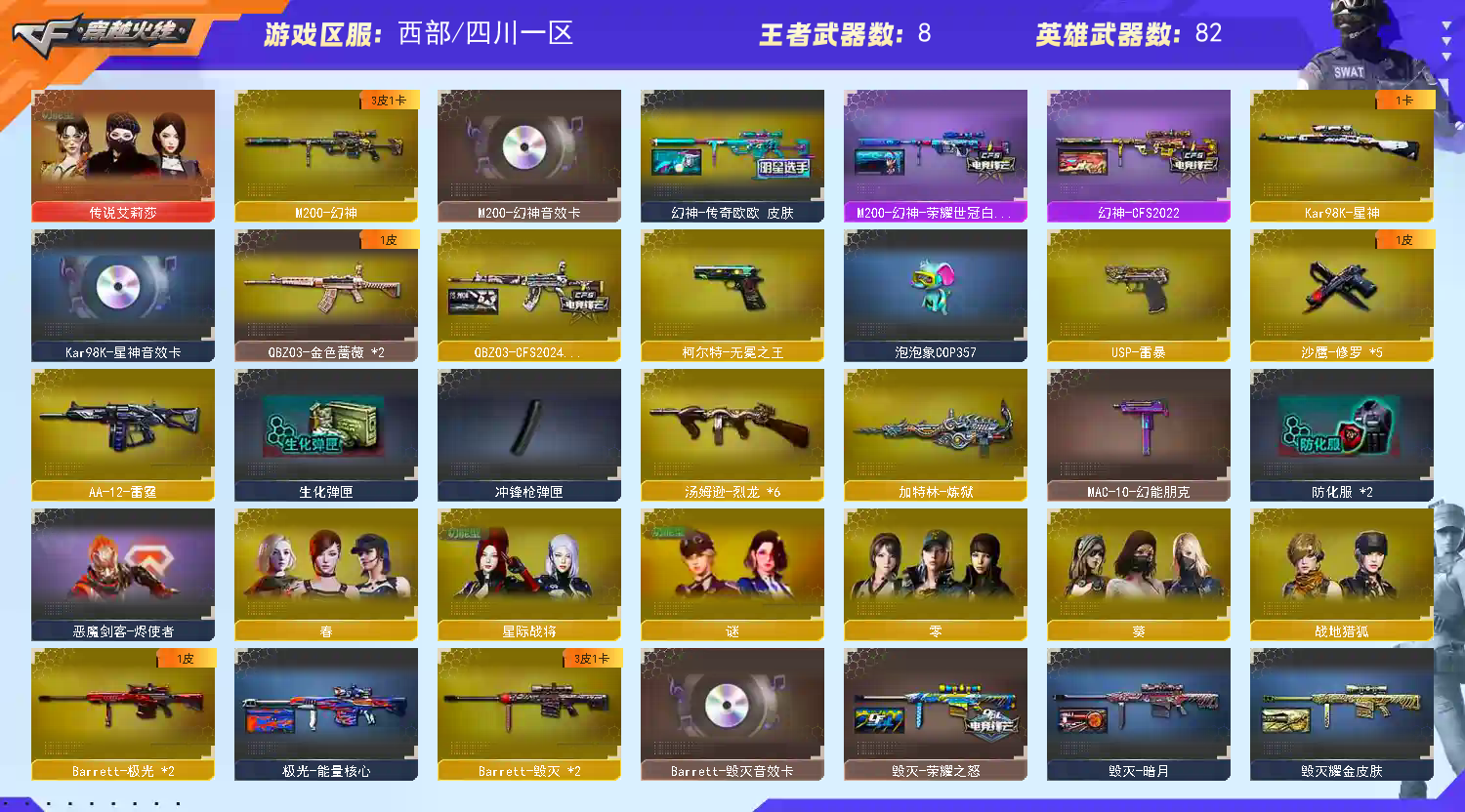 幻神三件套】【传说艾莉莎】【M200-幻神+音效卡+幻神-传奇欧欧+幻神-CFS2022+幻神-荣耀世冠白鲨】【Kar98K-星神+音效卡】【白虎之魄】【QBZ03-金色蔷薇】【生化 炼狱 6烈龙 死亡之眼 黄金猫猫手套白鲨】【Barrett-毁灭+音效卡+毁灭-荣耀之怒】【极光】【qbz银翼】【雷暴套】【AK47-火麒麟+音效卡】【黑龙】【M4A1-雷神】【黑骑士+音效卡】【王者之光 王者之力】【黑武士 超新星 黑鲨 hk417-朱雀 猎神 】【8手枪 修罗*5 usp雷暴 柯尔特无冕之王】【15近战 屠龙*3 龙啸*4 麒麟刺 斩神刀雷暴 王者之啸*2 王者之击*2】【手雷 雷霆雷 雷暴雷 】【角色 春 葵 不败狙神 乔伊教练 乔伊教练】【幻神音效卡 Kar98K-星神音效卡 Barrett-毁灭音效卡 AK47-火麒麟音效卡 黑骑士音效卡;USP-雷暴,柯尔特-无冕之王,传说艾莉莎,QBZ03-金色蔷薇,M200-幻神,Kar98K-星神,