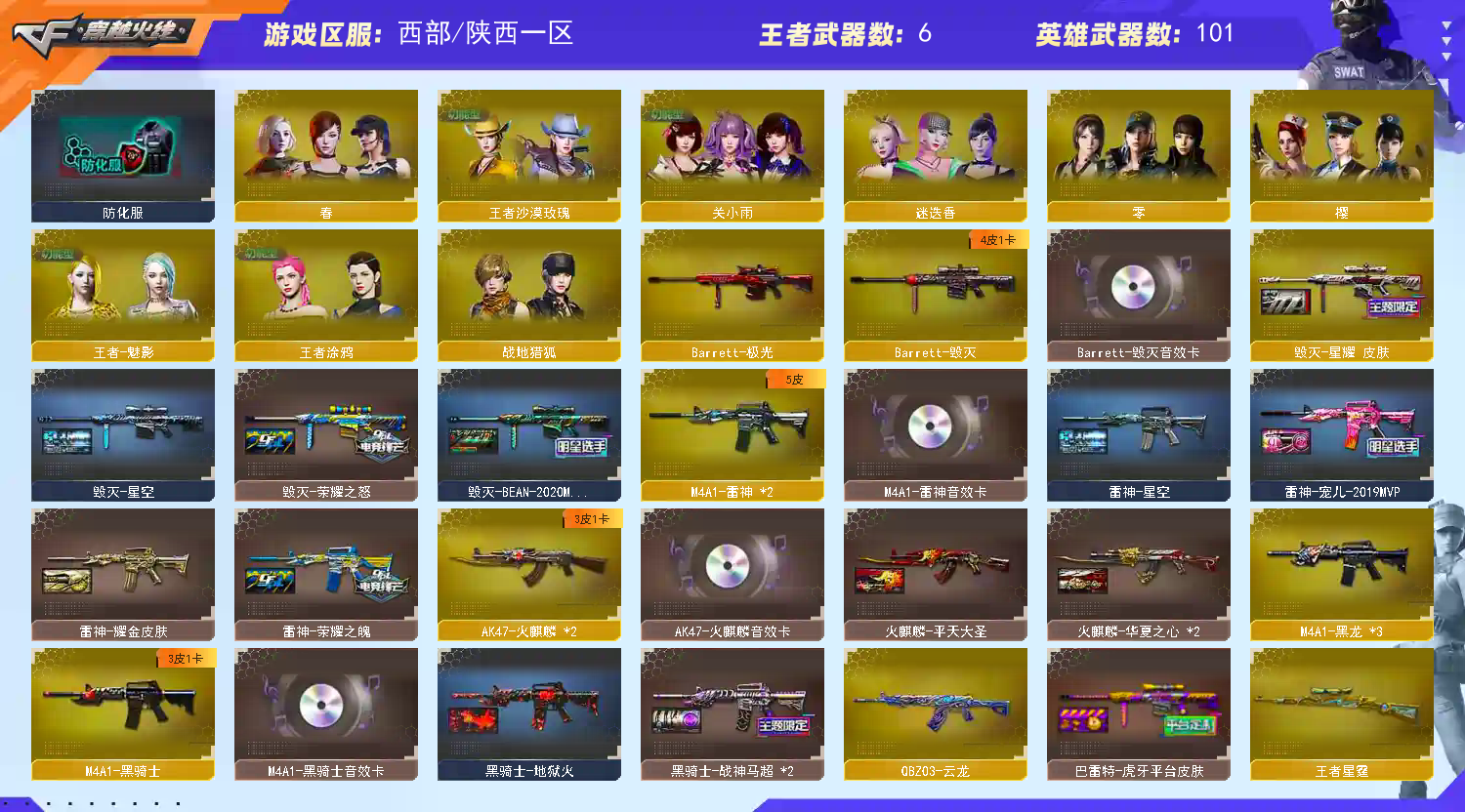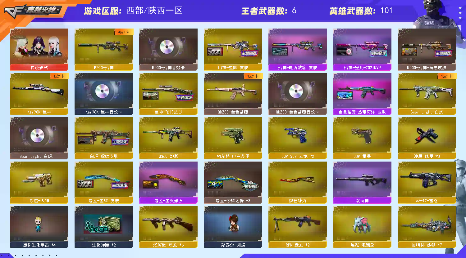 幻神三件套】【传说星骇】【M200-幻神+音效卡+幻神-星耀+幻神-黄忠+幻神-宠儿+幻神电流骇客】【Kar98K-星神+音效卡】【G36C-幻影】【ScarLight-白虎+音效卡+虎啸】【QBZ03-金色蔷薇+音效卡】【生化 2盘龙 6炼狱 6烈龙 泡泡象 蝴蝶 死亡之眼】【Barrett-毁灭+音效卡+毁灭-荣耀之怒】【极光】【AK47-火麒麟+音效卡】【黑龙】【M4A1-雷神+音效卡+雷神-宠儿+雷神-荣耀之魄】【黑骑士+音效卡+黑骑士-马超】【王者之力 王者星霆】【黑武士 天启 超新星 龙血 hk417-朱雀 烈火 海王】【10手枪 修罗*2 天神 usp雷暴 cop云龙*2 王者之魂*2】【14近战 屠龙*3 龙啸*2 擎天*2 麒麟刺 斩神刀雷暴 炽芒蝶刃蝴蝶刀 云龙扇 王者之刺】【手雷 雷暴雷 电竞装甲 云龙雷 】【四防 王者魅影 王者沙漠玫瑰 王者涂鸦】【幻神音效卡 Kar98K-星神音效卡 Barrett-毁灭音效卡 AK47-火麒麟音效卡 黑骑士音效卡 M4A1-雷神音效卡 qbz音效卡 ScarLight-白虎音效卡;USP-雷暴,炽芒蝶刃,传说影煞,王者沙漠玫瑰,RPK-盘龙,QBZ03-金色蔷薇,G36C-幻影,