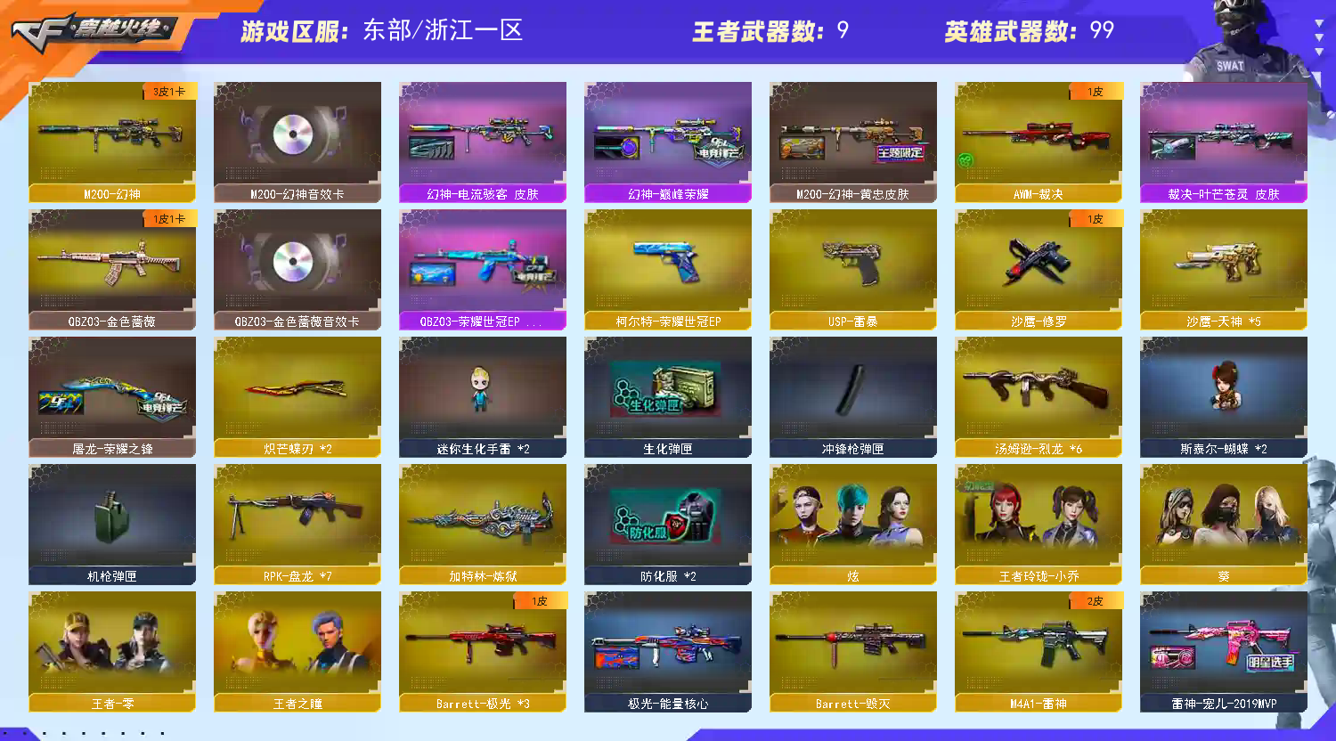 幻神三件套 生化六盘六烈+蝴蝶+蝴蝶刀 黄金妈妈手套白鲨】【M200-幻神+音效卡+幻神电流骇客+幻神巅峰荣耀+幻神-黄忠】【王者白虎】【QBZ03-金色蔷薇+音效卡+荣耀世冠ep】【生化 6盘龙 炼狱 6烈龙 死亡之眼 蝴蝶 黄金猫猫手套白鲨】【裁决+叶芒苍灵】【毁灭】【极光】【火麒麟+火麒麟-荣耀世冠ag】【雷神+雷神-宠儿】【黑骑士+音效卡+白马银枪】【王者之烈 王者之怒】【死神 黑武士 超新星 青龙 烈火】【11手枪 修罗 天神*5 usp雷暴 王者之魂 柯尔特荣耀世冠ep】【15近战 屠龙*4 龙啸*2 擎天 麒麟刺 斩神刀雷暴*2 王者之锋 王者之啸】【手雷 雷霆雷*4 雷暴雷*4 电竞装甲 云龙雷】【四防 王者玲珑小乔】;USP-雷暴,炽芒蝶刃,RPK-盘龙,QBZ03-金色蔷薇,M200-幻神,