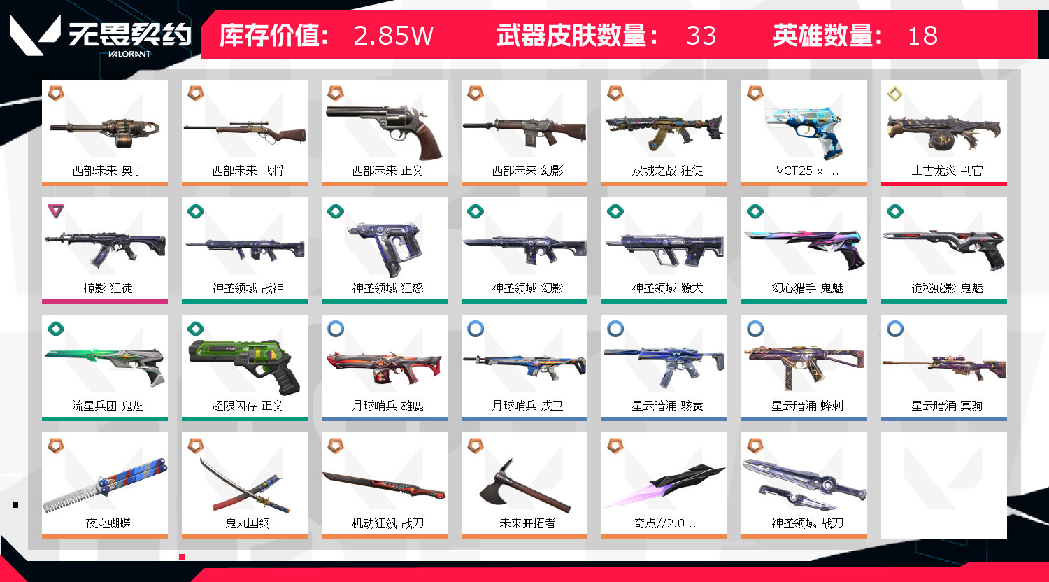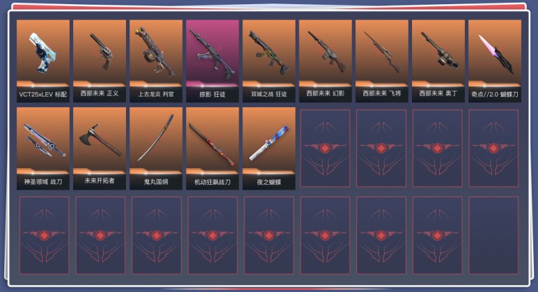 套装(1) 西部未来 近战武器皮肤(6) 机动狂飙*,夜之蝴蝶,*-奇点//2.0,鬼丸❤纲,神圣领域 *,未来开拓者 *皮肤(3) 狂徒-掠影,狂徒-双城之战,幻影-西部未来 佩枪皮肤(2) 标配-VCT25xLEV,正义-西部未来 *皮肤(1) 飞将-西部未来 *皮肤(1) 判官-上古龙炎 *皮肤(1) 奥丁-西部未来;西部未来 奥丁,上古龙炎 判官,掠影 狂徒,西部未来 飞将,西部未来 正义,