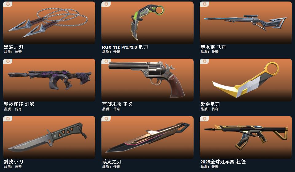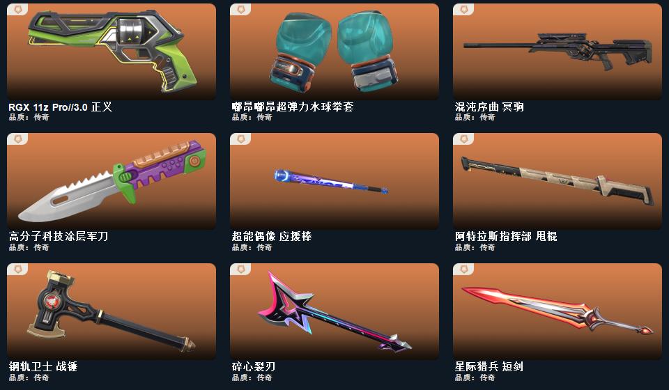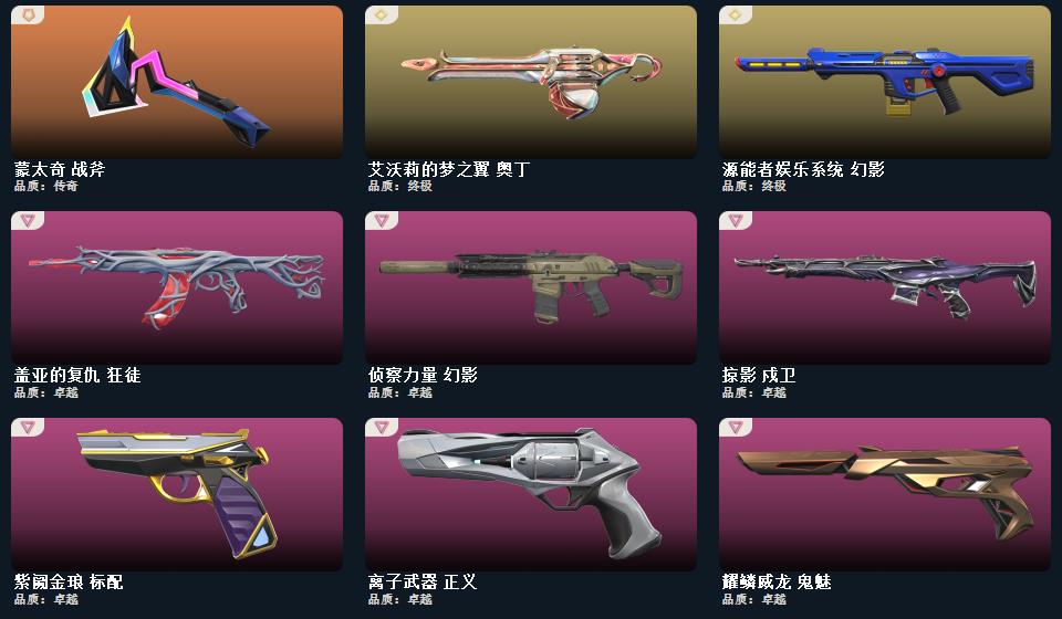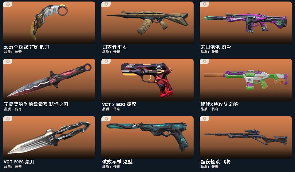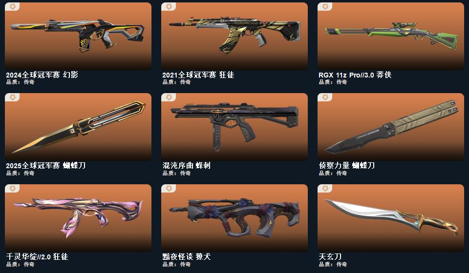 2021全球冠军赛套装,2025全球冠军赛套装,显卡3.0套装,耀鳞威龙套装;海洋之星 短炮,蒙太奇 狂怒,超集系统 标配,风暴之子 正义,幻心猎手 鬼魅,诛心猎手 正义,破败军械 鬼魅,西部未来 正义,甜心猎手 短炮,光环序列 狂怒,瑰梦艺语 鬼魅,星际猎兵 标配,阿特拉斯指挥部 标配,太空穿梭 正义,悠闲猫生 短炮,日耀风暴 正义,诡秘蛇影 鬼魅,星云暗涌 鬼魅,纳米打击 正义,离子武器 正义,模拟赫兹 鬼魅,浮光跃金 标配,VCT x EDG 标配,聚合之力 狂怒,采