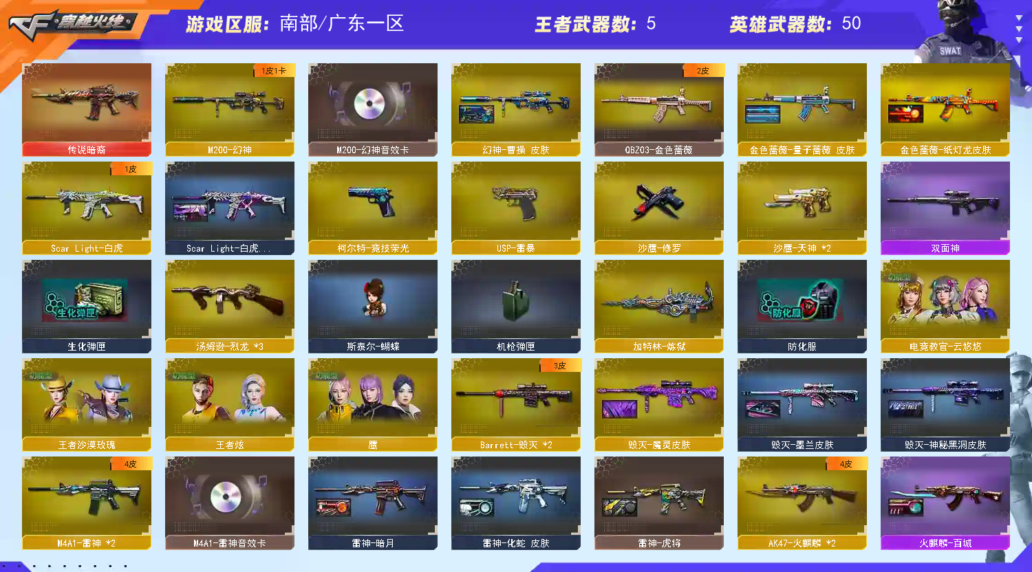 幻神三件套】【M200-幻神+音效卡+曹操】【竞技荣光套+四防云悠悠+usp雷暴】【王者星神】【传说暗裔】【ScarLight-白虎】【QBZ03-金色蔷薇+量子蔷薇】【生化 炼狱 3烈龙 蝴蝶】【Barrett-毁灭】【AK47-火麒麟】【M4A1-雷神+音效卡】【黑骑士+音效卡】【8手枪 修罗 天神*2 usp雷暴 竞技荣光 王者之魂】【7近战 屠龙 麒麟刺 幻灵之峰 王者之锋 竞技荣光】【手雷 堕天神 幻灵雷 竞技荣光 】【四防 王者沙漠玫瑰 王者炫】【幻神音效卡 黑骑士音效卡 M4A1-雷神音效卡;USP-雷暴,电竞教官-云悠悠,王者沙漠玫瑰,QBZ03-金色蔷薇,M200-幻神,Scar Light-白虎,传说暗裔,