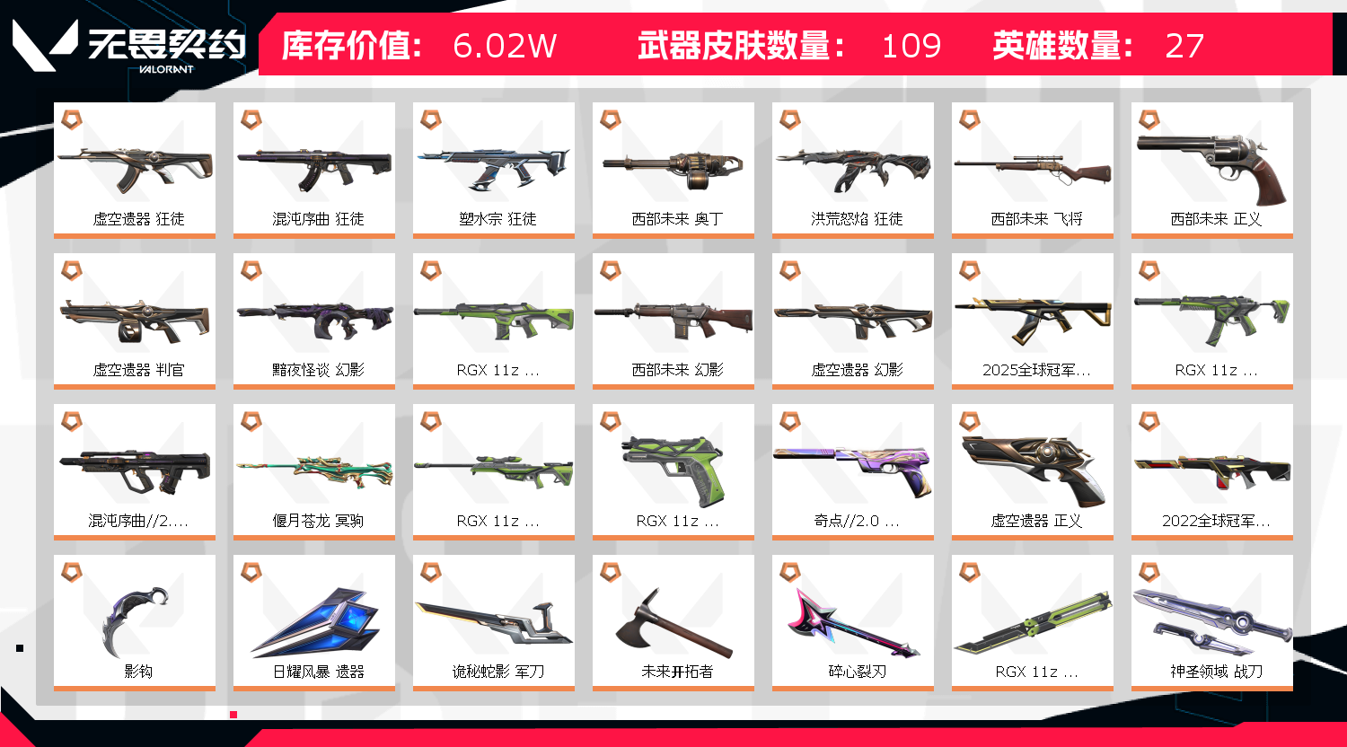 首页 > 租号大厅 > 无畏契约-wegame > wegame/wegame > 6W库/25冠军22冠军混沌套虚空套西部未来套显卡套雄狮狂徒盖亚狂徒戍卫堕天狂徒