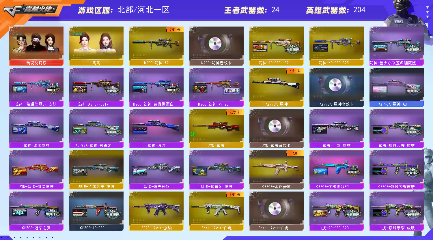 【商品标题】:北部河北一区-197V-可二次实名-【Lv.102-荣耀元帅】-【段位:荣耀之巅】 【稀有武器】:M200-幻神/Kar98K-星神/ScarLight-白虎/M4A1-青龙/M4A1-幻灵/M4A1-神工天巧/AK47-雷暴/USP-雷暴/COP-堕天神/COP357-幻灵(2)/USP-神工天巧/天神-动感闪耀/柯尔特-荣耀世冠白鲨2023/修罗-古蛇迷踪/荣耀世冠-柯尔特/柯尔特-冠军之特/金色蔷薇-古蛇迷踪/QBZ03-金色蔷薇/AK47-火麒麟(4)/M4A1-黑龙/M4A1-雷神(2)/M4A1-黑骑士/AK47-黑武士/荣耀世冠-火麒麟/荣耀世冠-雷神/Barrett-毁灭(2)/Barrett-极光/AWM-裁决/加特林-炼狱(2)/汤姆逊-烈龙(2)/炽芒蝶刃/斩神刀-雷暴/马来剑-夜魔/幻灵之锋/擎天-竞技荣光/唐刀-神工天巧/云龙扇 【王者武器】:王者之心-觉醒版/白虎之魄-觉醒版/王者之怒-觉醒版/王者之力-觉醒版/王者风神-觉醒版/王者之魄(2)/王者星霆/王者之霆 【热门角色】:传说艾莉莎/春/兰-巾帼英雄/影豹/隼/魅影/奇洋探员/乔伊教练/蛇隐宗/王者春/王者潘多拉/新海豹突击队/空/潘多拉-X/兔囡囡/潘多拉 【热门音效卡】:M200-幻神音效卡/AWM-裁决音效卡/Scar Light-白虎音效卡/Barrett-毁灭音效卡/Barrett-极光音效卡 【热门皮肤】:幻神-AG-CFPLS24冠军皮肤/M200-幻神-N9-2022MVP/幻神-星火小队签名臻藏版皮肤/M200-幻神-荣耀世冠白鲨/幻神-AG-CFPLS17冠军/裁决-巅峰荣耀皮肤/星神-漫游/屠龙-星火燎原/QBZ03-巅峰荣耀皮肤/裁决-羽掣皮肤/Kar98K-星神-冠军之星皮肤/雷神-R.LGD-CFPLS18冠军/擎天-冠军之击(4)/火麒麟-巅峰荣耀/QBZ03-冠军之薇/白虎-巅峰荣耀 皮肤/屠龙-破浪逐光皮肤/炼狱-电子连击皮肤/死神-机甲核心皮肤/星神-璀璨皮肤/裁决-流光秘银/白虎-AG-CFPLS20冠军/QBZ03-AG-CFPLS19冠军/屠龙-巅峰荣耀皮肤/毁灭-冠军之怒/屠龙-荣耀之锋(2)/毁灭-荣耀之怒/屠龙-春桃皮肤/龙啸-冠军之啸(2)/炽芒蝶刃-冠军炽芒皮肤(2)/雷神-荣耀之魄 【其他亮点】:斯泰尔-蝴蝶/炼狱-迷你小钢/Knife-冠军之刃/斯泰尔-枪娘暗刃/贝雷塔687-射手座/黄金猫猫手套-白鲨/烟雾弹-荣耀世冠白鲨2023/哔哩哔哩名片 (截图展示段位不代表实际段位,如赛季更新等不可抗拒因素发生变化,其余道具看截图或咨询客服);USP-雷暴,USP-雷暴王者,荣耀世冠-柯尔特,柯尔特-荣耀世冠白鲨2023,柯尔特-冠军之特,炽芒蝶刃,Knife-冠军之刃,