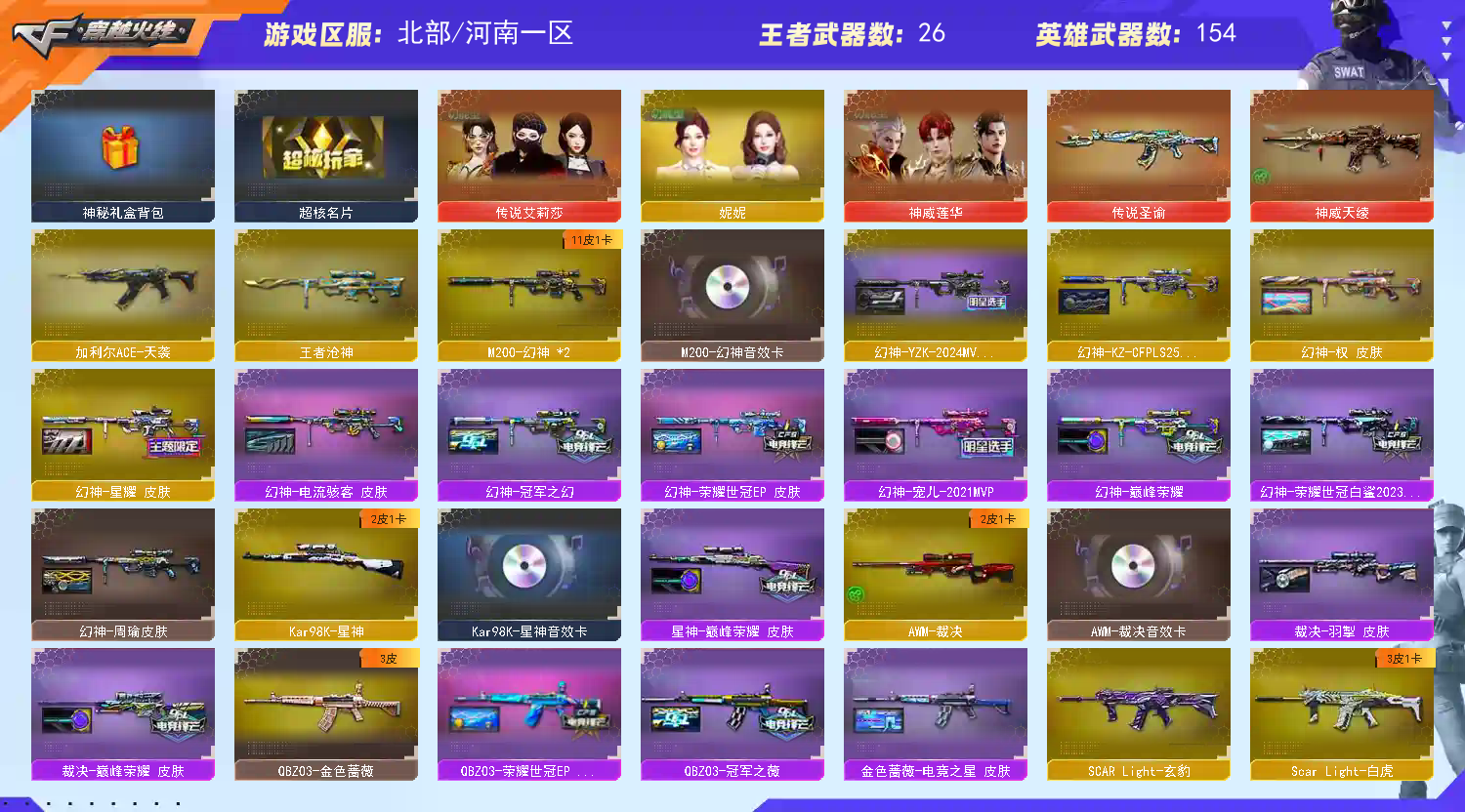 【商品标题】:北部河南一区-172V-可二次实名-【Lv.100.2-高阶大元帅】-【段位:荣耀之巅】 【稀有武器】:M200-幻神(2)/Kar98K-星神/八面凌龙/G36C-幻影/ScarLight-白虎/M4A1-幻灵/雷霆之契/COP357-幻灵(2)/柯尔特-竞技荣光/柯尔特-荣耀世冠白鲨2023/柯尔特-无冕之王(2)/修罗-古蛇迷踪/破空枪刃/沙鹰-幻兽(5)/柯尔特-冠军之特(3)/金色蔷薇-古蛇迷踪/QBZ03-金色蔷薇/QBZ95-幻兽/AK47-火麒麟/M4A1-黑龙/M4A1-雷神(2)/M4A1-黑骑士(4)/Barrett-毁灭(2)/Barrett-极光/AWM-裁决/M200-竞技荣光/RPK-盘龙(5)/加特林-炼狱/汤姆逊-烈龙(5)/AA-12-雷霆/炽芒蝶刃(6)/幻灵之锋(2)/擎天-竞技荣光/女皇利刃-幻兽 【王者武器】:王者之心/王者之光 【热门角色】:传说艾莉莎/电竞教官-云悠悠/蝴蝶/晴雅/鹰/隼/蛇隐宗/灵狐者-职业经理/兔囡囡/潘多拉 【热门音效卡】:M200-幻神音效卡/Kar98K-星神音效卡/AWM-裁决音效卡/Scar Light-白虎音效卡/Barrett-毁灭音效卡/M4A1-黑骑士音效卡/八面凌龙音效卡 【热门皮肤】:幻神-星耀皮肤/幻神-荣耀世冠白鲨2023皮肤/幻神-宠儿-2021MVP/幻神-冠军之幻/幻神-巅峰荣耀/幻神-电流骇客皮肤/幻神-周瑜皮肤/幻影-破浪逐光皮肤/八面凌龙-封心寒雪皮肤/八面凌龙-森林领主皮肤/八面凌龙-不朽玄君皮肤/荣耀之魄-CFPL十周年臻藏版/屠龙-星火燎原/裁决-羽掣皮肤/星神-巅峰荣耀 皮肤/QBZ03-冠军之薇/白虎-巅峰荣耀 皮肤/屠龙-破浪逐光皮肤/炽芒蝶刃-荣耀世冠白鲨2023皮肤(2)/屠龙-荣耀之锋(2)/毁灭-荣耀之怒/屠龙-春桃皮肤/雷神-荣耀之魄 【其他亮点】:斯泰尔-蝴蝶/炼狱-泡泡象/Knife-冠军之刃(3)/异变清道夫/斯泰尔-枪娘暗刃(2)/贝雷塔687-射手座/MAC-10-龙宝/烟雾弹-荣耀世冠白鲨2023(2)/超核名片 (截图展示段位不代表实际段位,如赛季更新等不可抗拒因素发生变化,其余道具看截图或咨询客服);柯尔特-无冕之王,USP-雷暴王者,柯尔特-荣耀世冠白鲨2023,柯尔特-冠军之特,炽芒蝶刃,Knife-冠军之刃,隼,