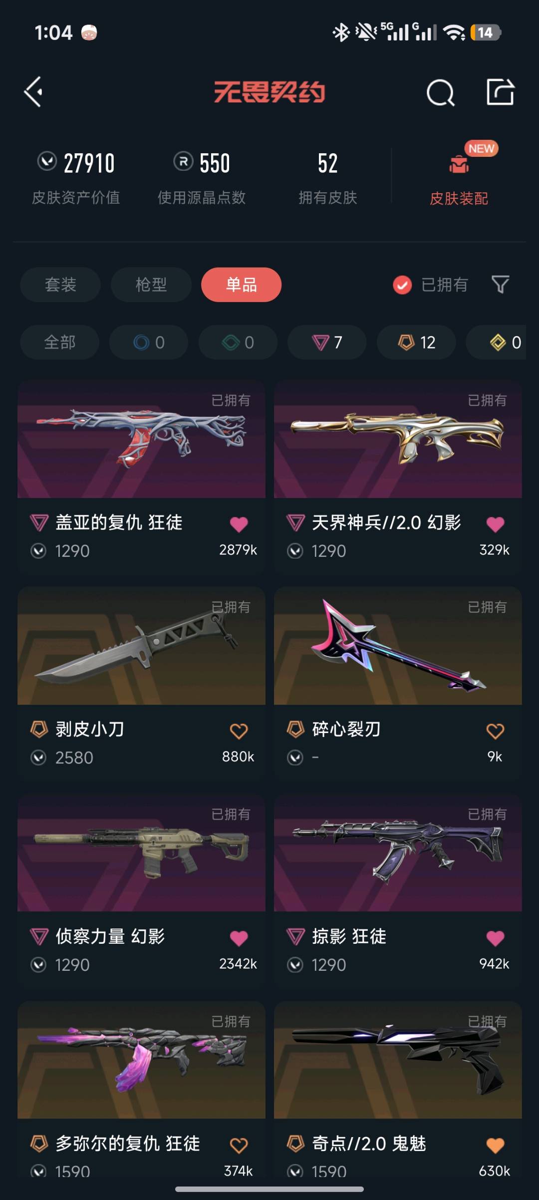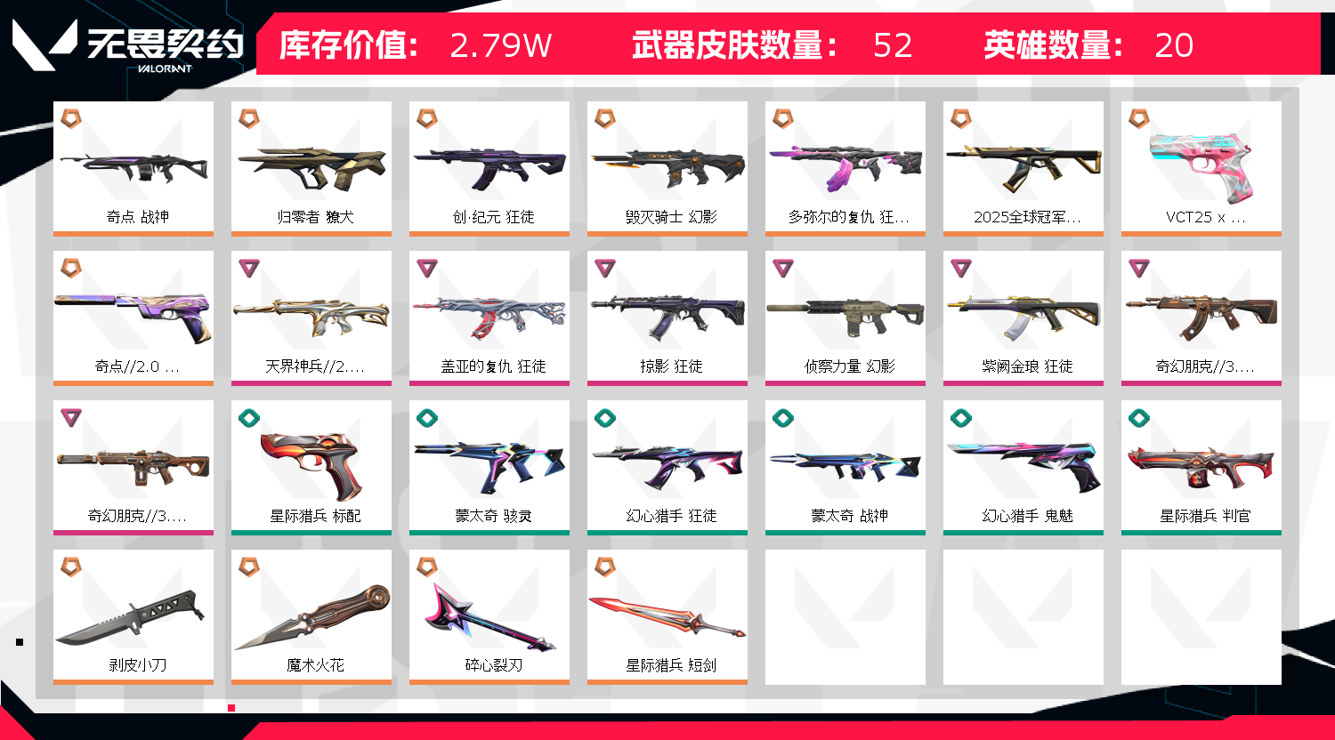 禁止开挂!禁止开挂!禁止开挂!!(已进行网络财产备案,使用外挂脚本导致游戏账号封禁直接向平台提取ip地址,并移交警方处理) 危险号 禁止暴力炸鱼!禁止暴力炸鱼!(瓦的封号机制太特殊,老板不要杀太多,现在风控的严重,杀多了会临时冻结甚至封号,到时候我可能不在无法解冻!若因炸鱼封号七天及以上押金不退) 买家也请不要骚扰号主在线好友。 如遇冻结可通过平台联系号主解冻(00:00-8:30除外) 关于登陆 1.登陆界面稍等2分钟会上去(自动登录)老板不要着急,一次不行多来几次wegame界面要耐心等2分钟 2.密令会自动输入如果一次不成功多来几次。 3..如果进入wegame后到弹短信验证处,关闭掉,重新下载无畏契约整个游戏即可成功上号 4.请及时续租不要挂机,到时不下线,但是下一个会挤号导致挂机,所以请及时续租 高质量枪皮小号,偶尔会补充皮肤 喜欢可以收藏关注,谢谢各位老板;奇点 战神,剥皮小刀,天界神兵//2.0 幻影,归零者 獠犬,盖亚的复仇 狂徒,掠影 狂徒,侦察力量 幻影,