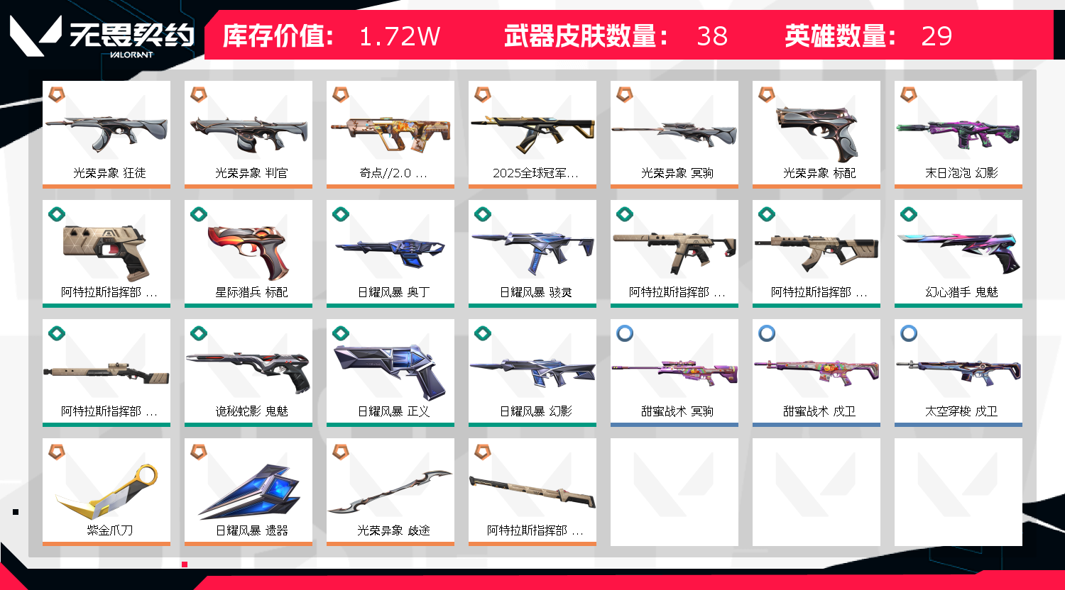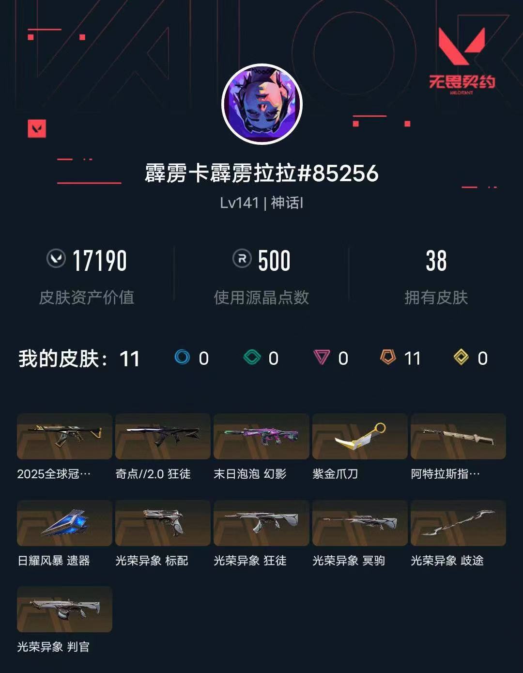 首页 > 租号大厅 > 无畏契约-wegame > wegame/wegame > ✨25冠军狂徒✨紫金爪刀✨光荣套装✨奇点狂徒✨末日泡泡幻影✨ 高段位请勿挂机开挂账号来之不易