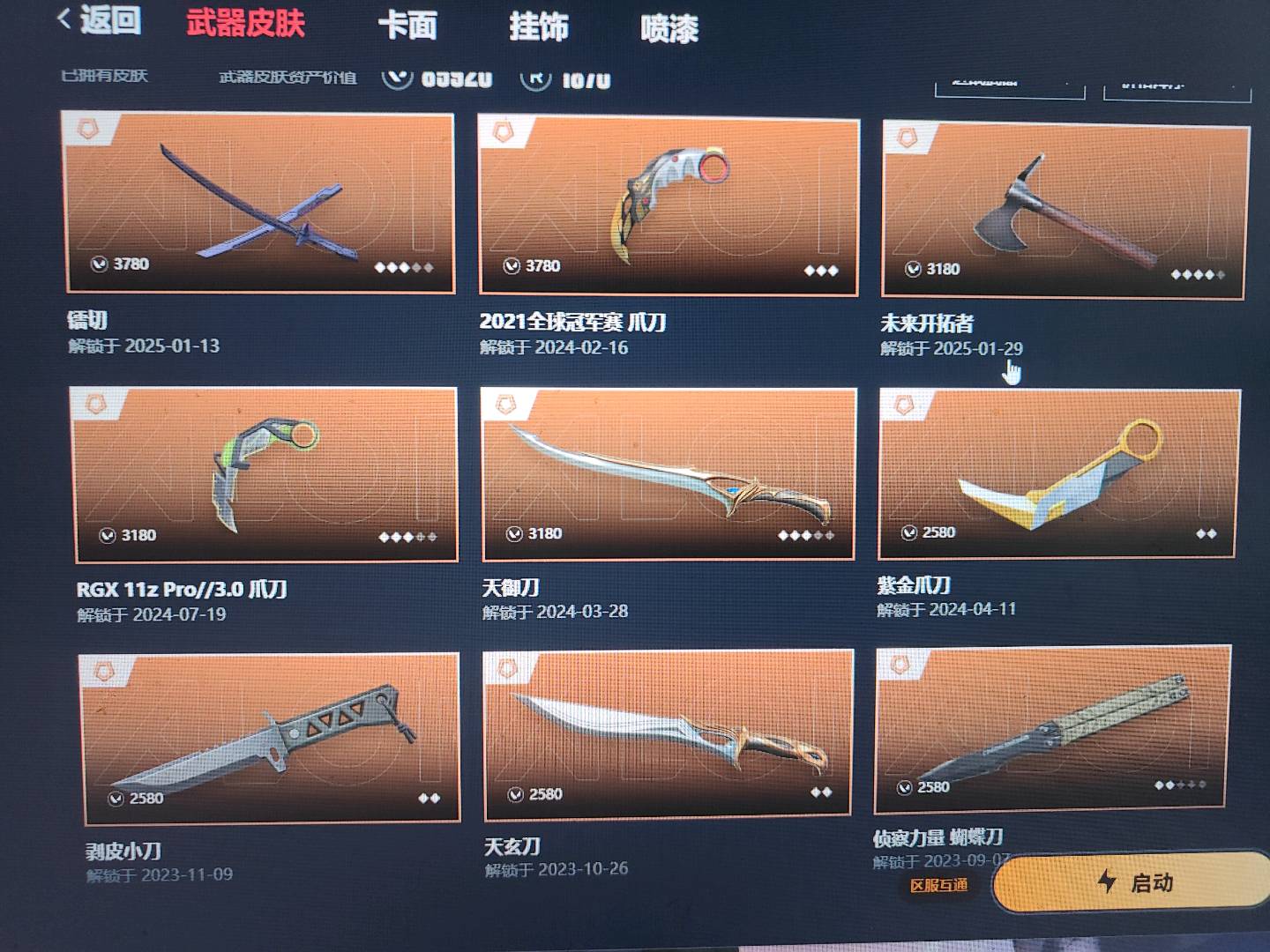 AK 21/23/25冠军/艾沃利/创纪元/塑水宗/显卡/洪荒怒焰/苍龙/混沌/归零者/掠影/狮子/堕天/盖亚/紫金/冰点 M4 西部/洪荒怒焰/般若/侦查 鬼魅 天界/猴子/威龙/盖亚 苍龙归零冰点大狙 近战 镭切/显卡爪刀/天御刀/紫金爪/剥皮/天玄刀,侦查蝴蝶/鱼扇;西部未来 奥丁,紫金爪刀,剥皮小刀,镭切,归零者 獠犬,盖亚的复仇 狂徒,掠影 戍卫,