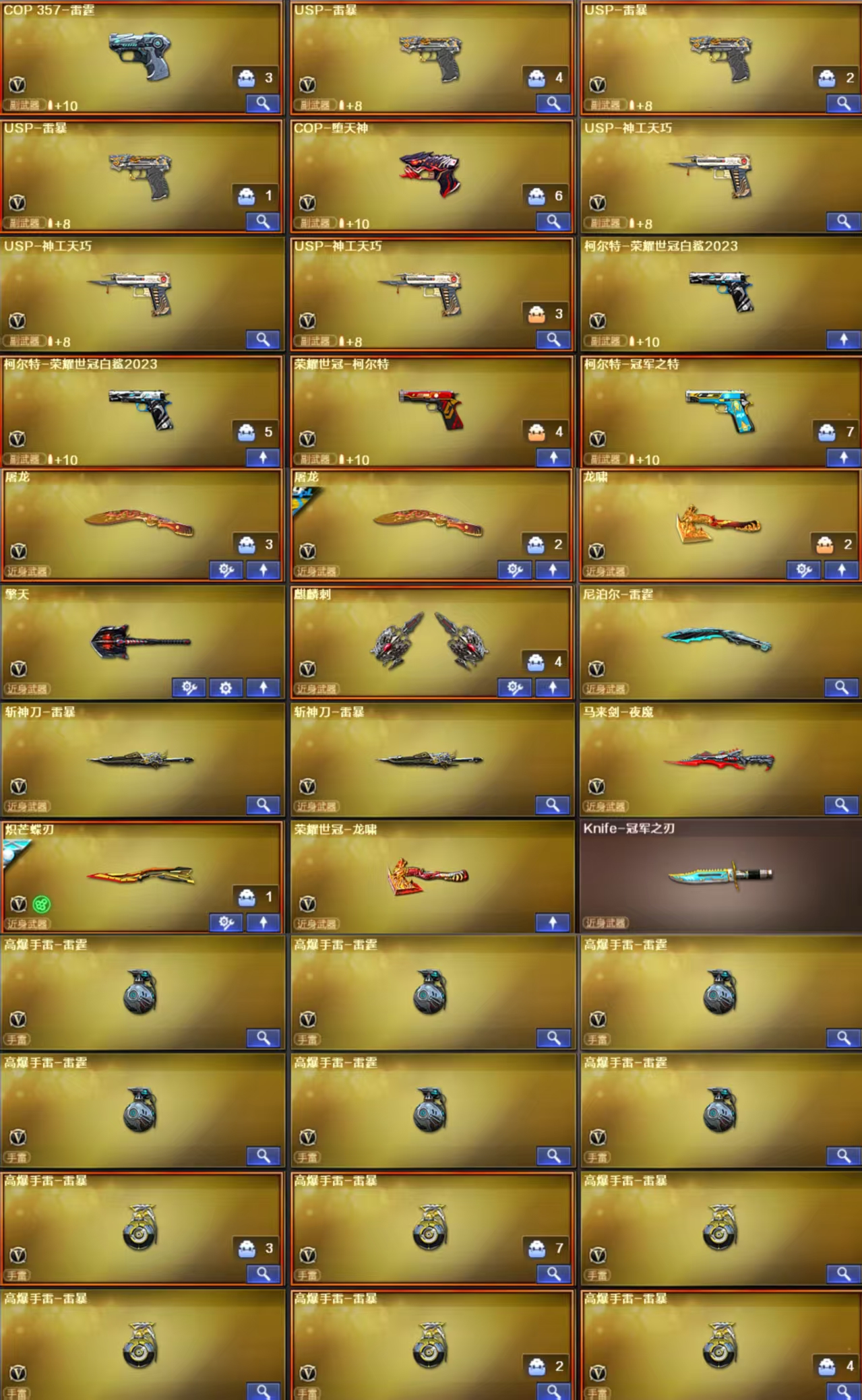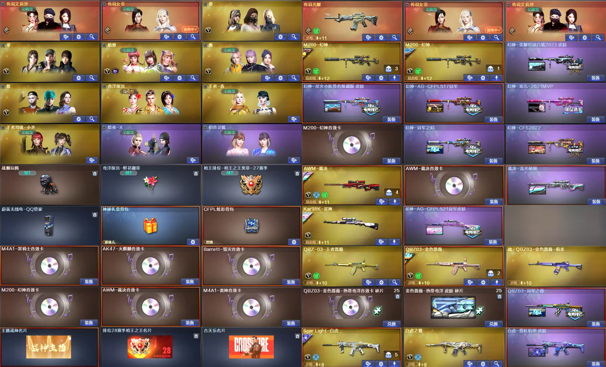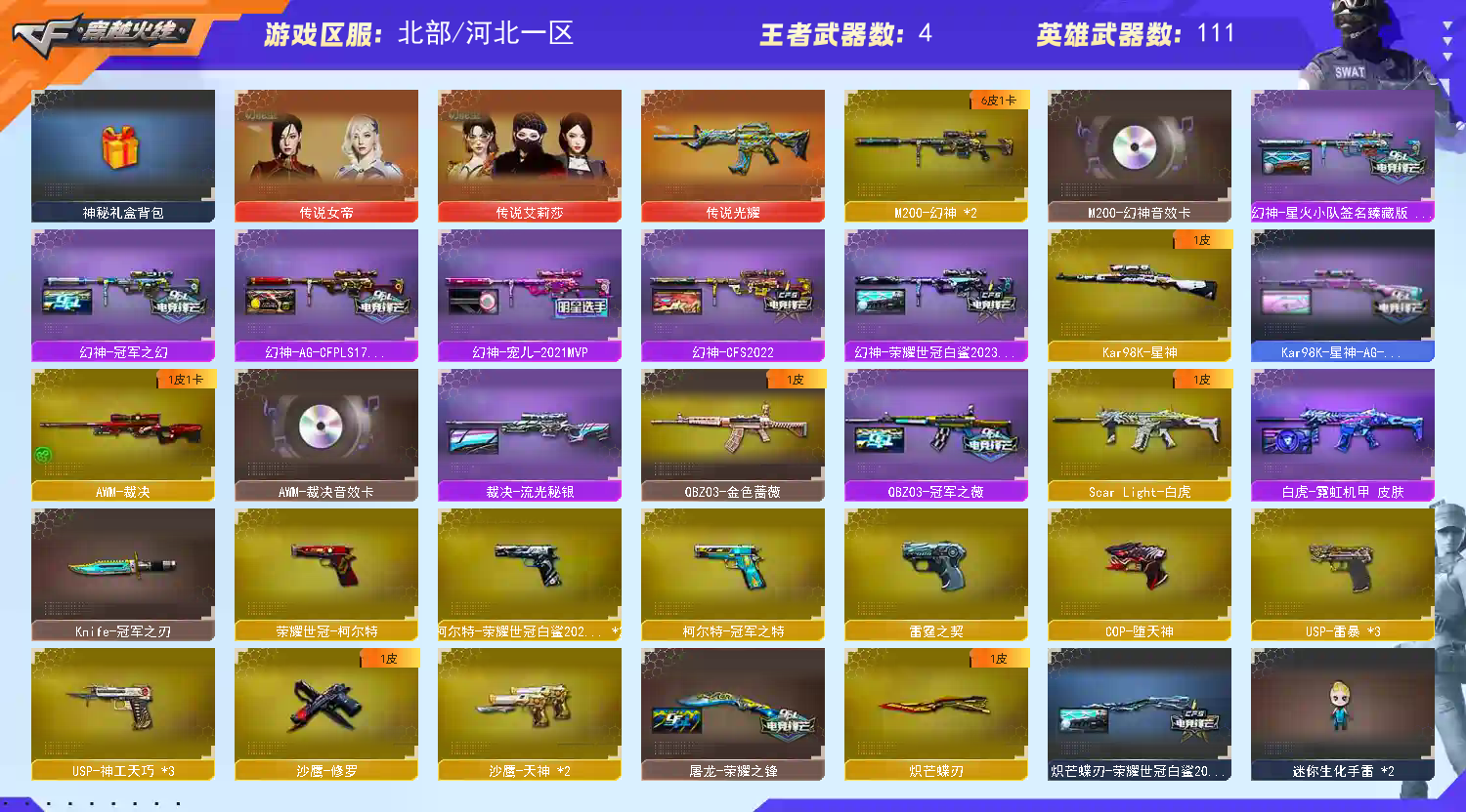 传说女帝 传说艾莉莎 幻神星火小队老AG6皮三件套 星神AG 裁决音效卡 白虎皮qbz皮 雷神荣耀 副武器满配 神秘礼盒背包金名;USP-雷暴,荣耀世冠-柯尔特,柯尔特-荣耀世冠白鲨2023,柯尔特-冠军之特,炽芒蝶刃,Knife-冠军之刃,传说女帝,