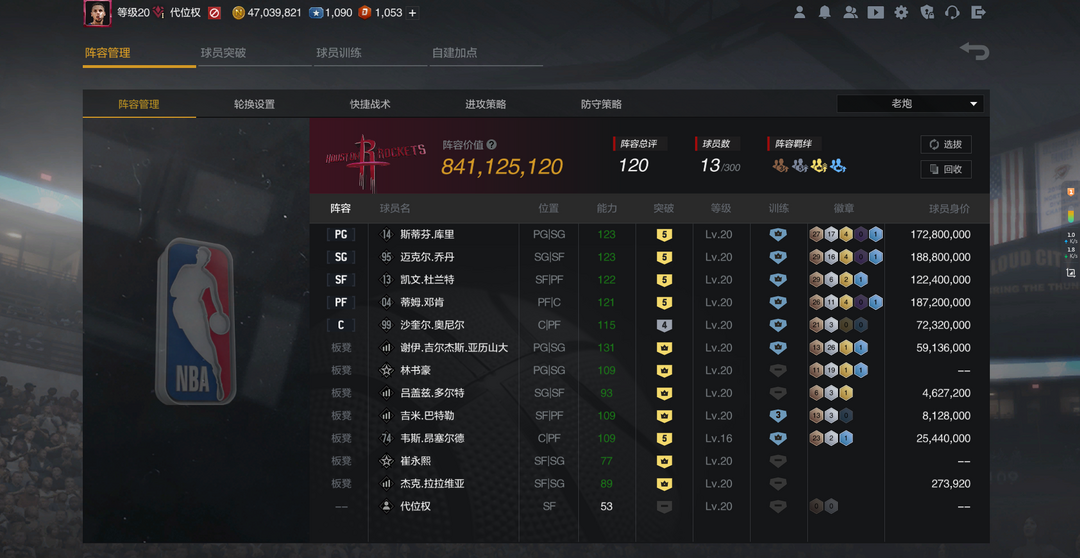 (8.4亿王朝7满训)陈列室5乔丹+5库里+5杜兰特+5石佛+4鲨鱼