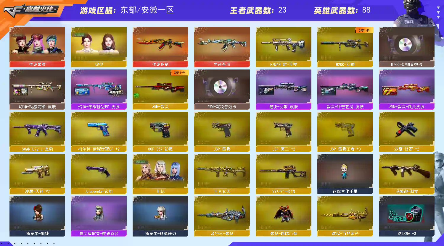 幻神三件套 裁决三件套】【四防传说星骇】【M200-幻神+音效卡+荣耀世冠ep+幻神动感闪耀】【传说夜影】【传说圣谕】【白虎之魄】【王者凌虎】【小人枪 迷你小钢 蝴蝶】【裁决+音效卡+叶芒苍灵】【Barrett-毁灭+音效卡+定军扬威】【天戎】【玄豹】【AK47-火麒麟】【黑龙】【M4A1-雷神+雷神-荣耀世冠ag】【黑骑士+音效卡】【王者玄武 王者之势】【黑武士 天罚 】【14手枪 修罗*2 天神*2 usp雷暴 cop幻灵 usp冥王*2 usp雷暴王者 柯尔特-荣耀世冠ep*2】【14近战 擎天*2 幻灵之锋*4 王者冰锋*2】【手雷 幻灵雷 玄豹 雷暴王者 】【四防 荆棘 妮妮 王者春 王者影豹 】【幻神音效卡 裁决音效卡 Barrett-毁灭音效卡 黑骑士音效卡;USP-雷暴,USP-雷暴王者,传说星骇,妮妮,M200-幻神,传说圣谕,