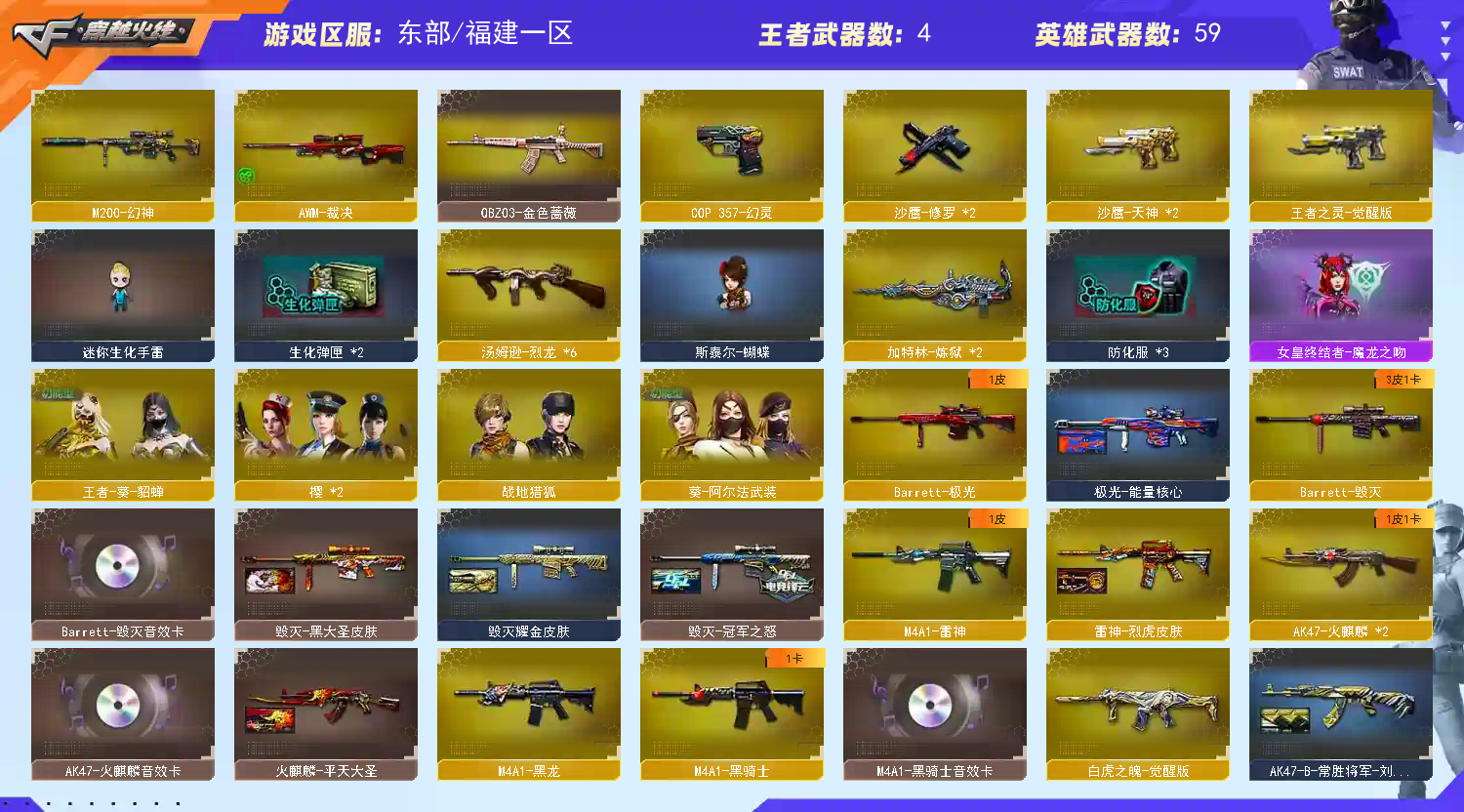【主武】:火麒麟、、天龙、、黑龙、雷神、烈龙六把 、黑骑士、玫瑰精灵、毁灭、无影、贝雷塔、金牛座、极光、死神、天蝎座、黑武士、征服者、死亡之眼、炼狱、斯泰尔巧克力、火麒麟暗月、火麒麟能量核心、黑武士暗月、黑武士能量核心、机械迷城、源-雷神、QBZ03-金色蔷薇、Barrett-金色蔷薇、AWM裁决、激光毁灭者3级、雷神-暗月、黑鲨、龙血、9A91-烈火M200幻神、神圣爆裂者III、Barrett-朱雀、火麒麟STAR(皮肤)、荣耀之怒(皮肤)、毁灭耀金(皮肤)、雷神星空(皮肤)、毁灭星空(皮肤)、荣耀之怒(皮肤)雷霆、修罗STAR(皮肤)【近身】:屠龙、龙鳞、龙啸、擎天、麒麟刺、双子座、巨蟹座、屠龙-秘银、女皇利刃幻兽、啸天(拳套)、幻刺光剑、尼泊尔-雷霆、荣耀之锋(皮肤)【投掷】:生化手雷、胜利之光、银烟、凤舞云烟、凤凰之息、高爆幻兽、闪光幻兽、烟雾幻兽、闪光雷霆、高爆雷霆、烟雾雷霆、高爆雷暴、闪光雷暴、烟雾雷暴【道具】:防弹头、防弹衣、手雷包、C4工具钳、手枪弹匣、散弹弹匣、冲锋弹匣、步枪弹匣、机枪弹匣、狙击弹匣、防化服、生化弹匣、不退包、绿色巨人、疯狂宝贝、彩字、彩昵、夺命之镰、幽灵之刃、火麒麟音效卡、毁灭音效卡、、天龙白鲨(皮肤)、暴躁猪玩偶、敖丙玩偶、哪吒玩偶、护目镜、烟雾头、炫彩背包、超级背包、超级护目镜、特殊水壶、透明头盔、透明护目镜、闪光护目镜、14个背包;QBZ03-金色蔷薇,M200-幻神,