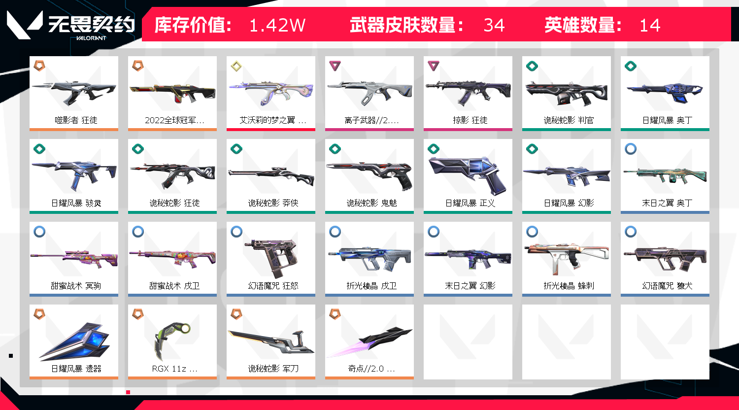 允许 英雄13 武器皮肤数量34;噬影者 狂徒,掠影 狂徒,离子武器//2.0 狂徒,