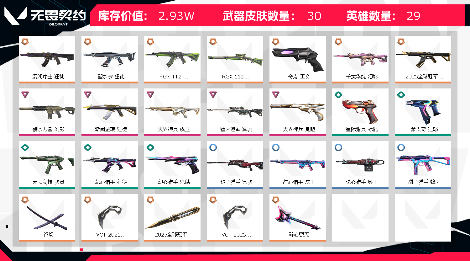 禁止暴力炸鱼 禁止挂机 禁止开挂 有25vct爪刀 冠军套;镭切,VCT 2025 爪刀,侦察力量 幻影,紫阙金琅 狂徒,RGX 11z Pro 狂徒,天界神兵 戍卫,混沌序曲 狂徒,