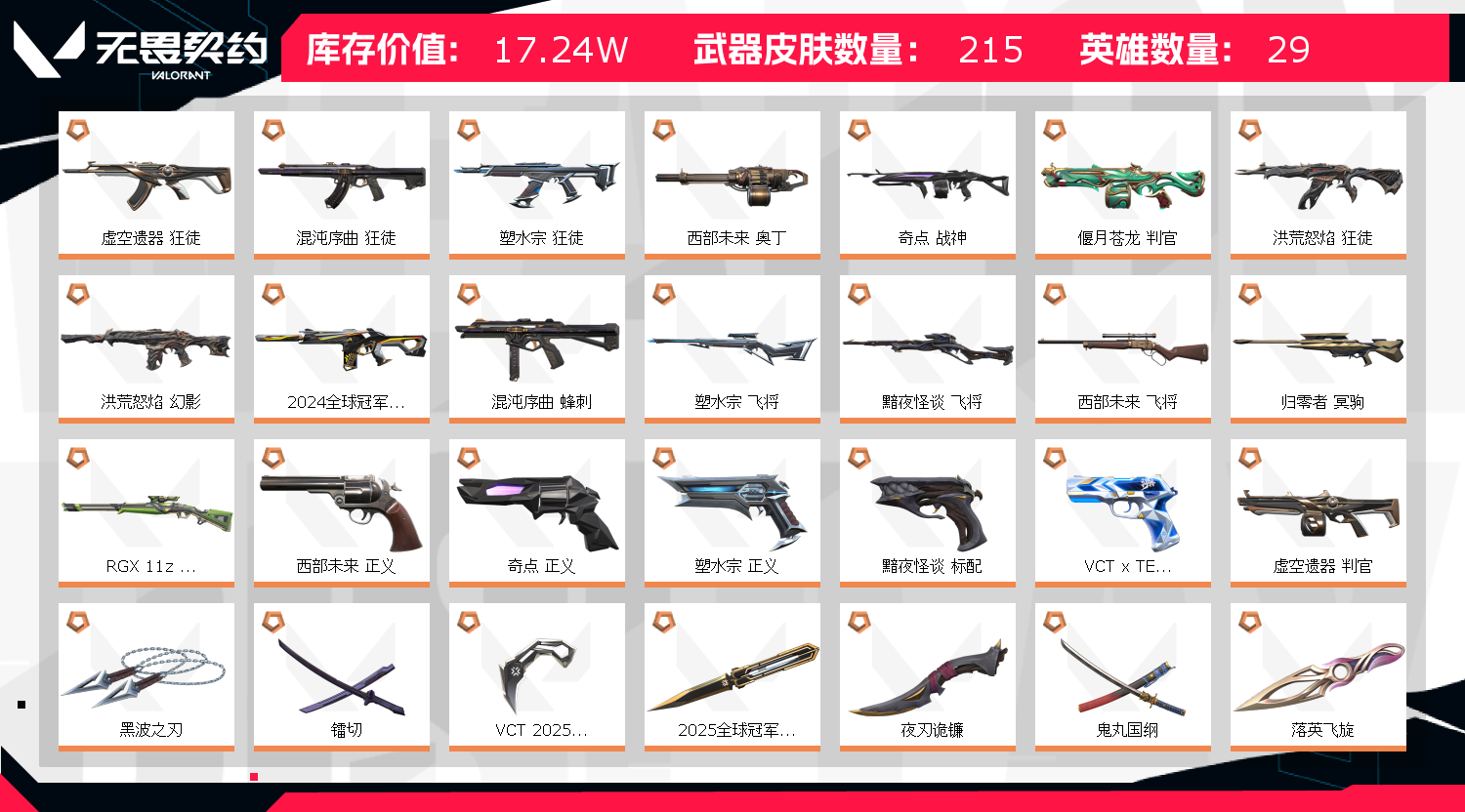 十七万究极大库存 皮肤全面 禁止挂机 冻结发协助自动解冻;艾沃莉的梦之翼 奥丁,西部未来 奥丁,奇点 战神,黑波之刃,镭切,VCT 2025 爪刀,偃月苍龙 判官,