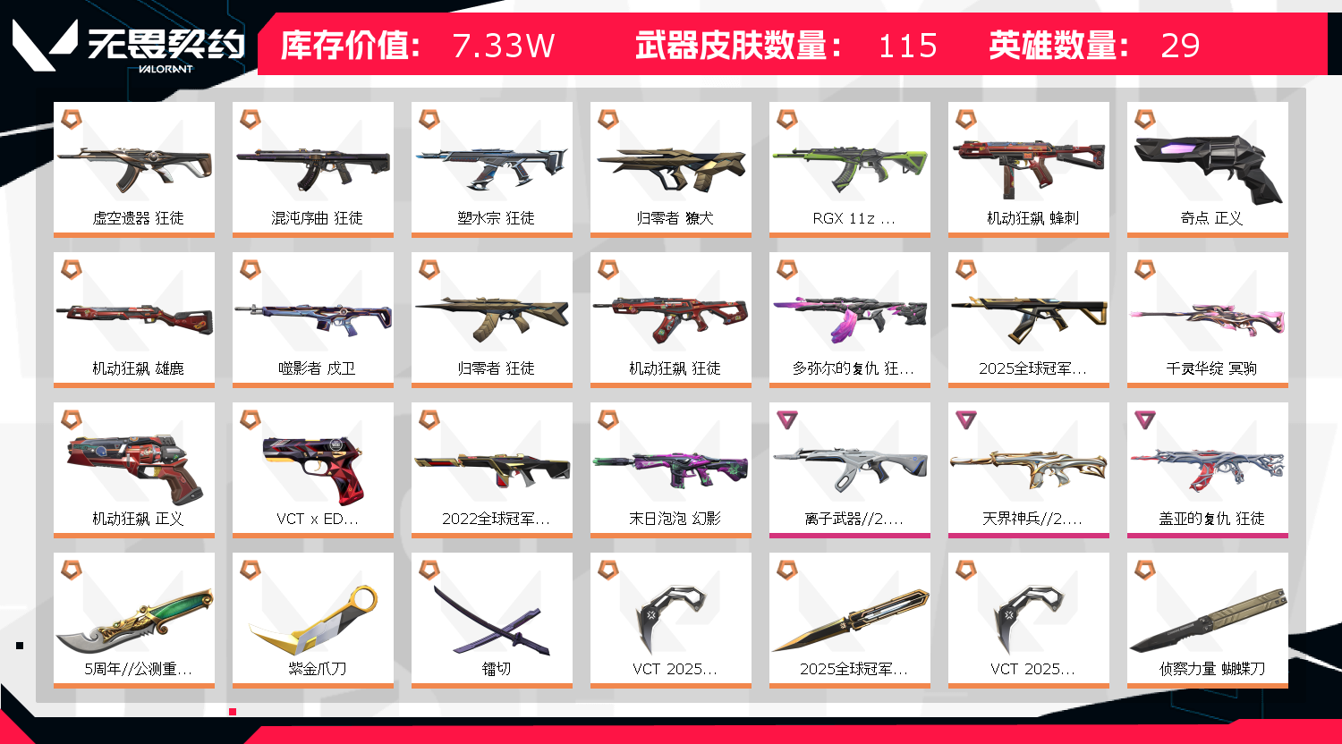 可排位 英雄28 武器皮肤数量115;5周年//公测重制版 苍龙之刃,紫金爪刀,镭切,VCT 2025 爪刀,天界神兵//2.0 幻影,归零者 獠犬,盖亚的复仇 狂徒,