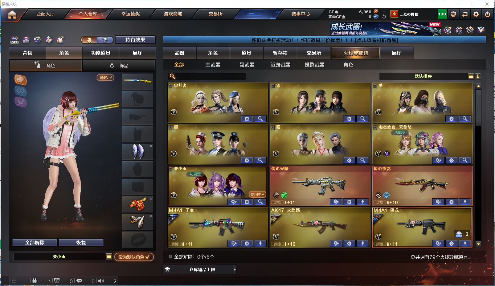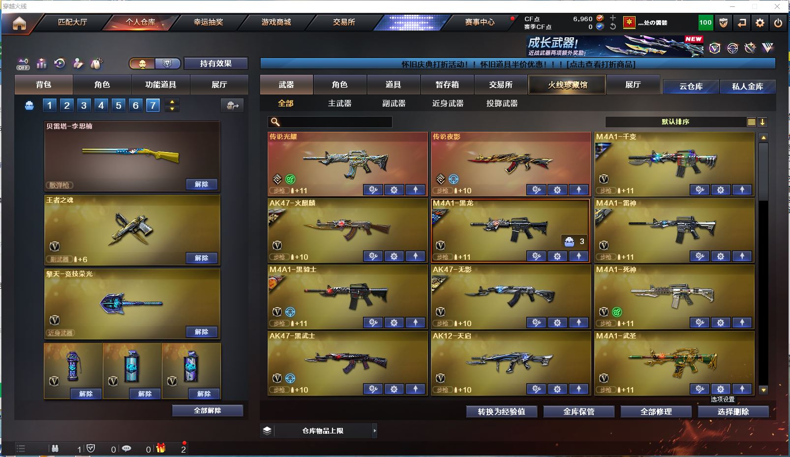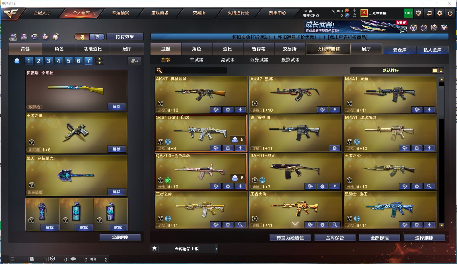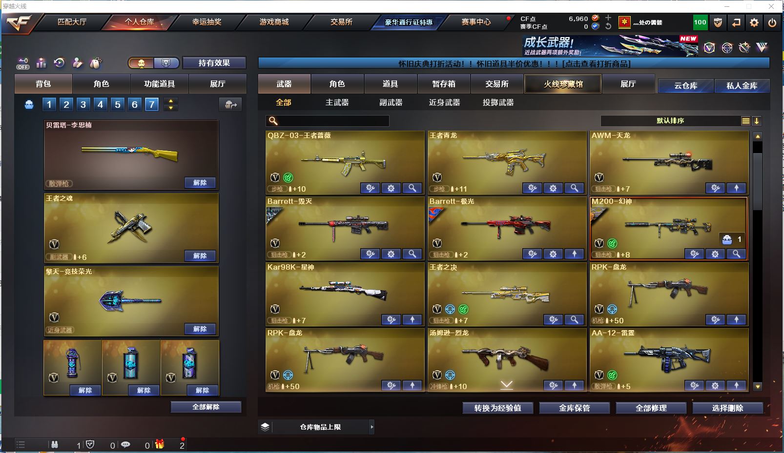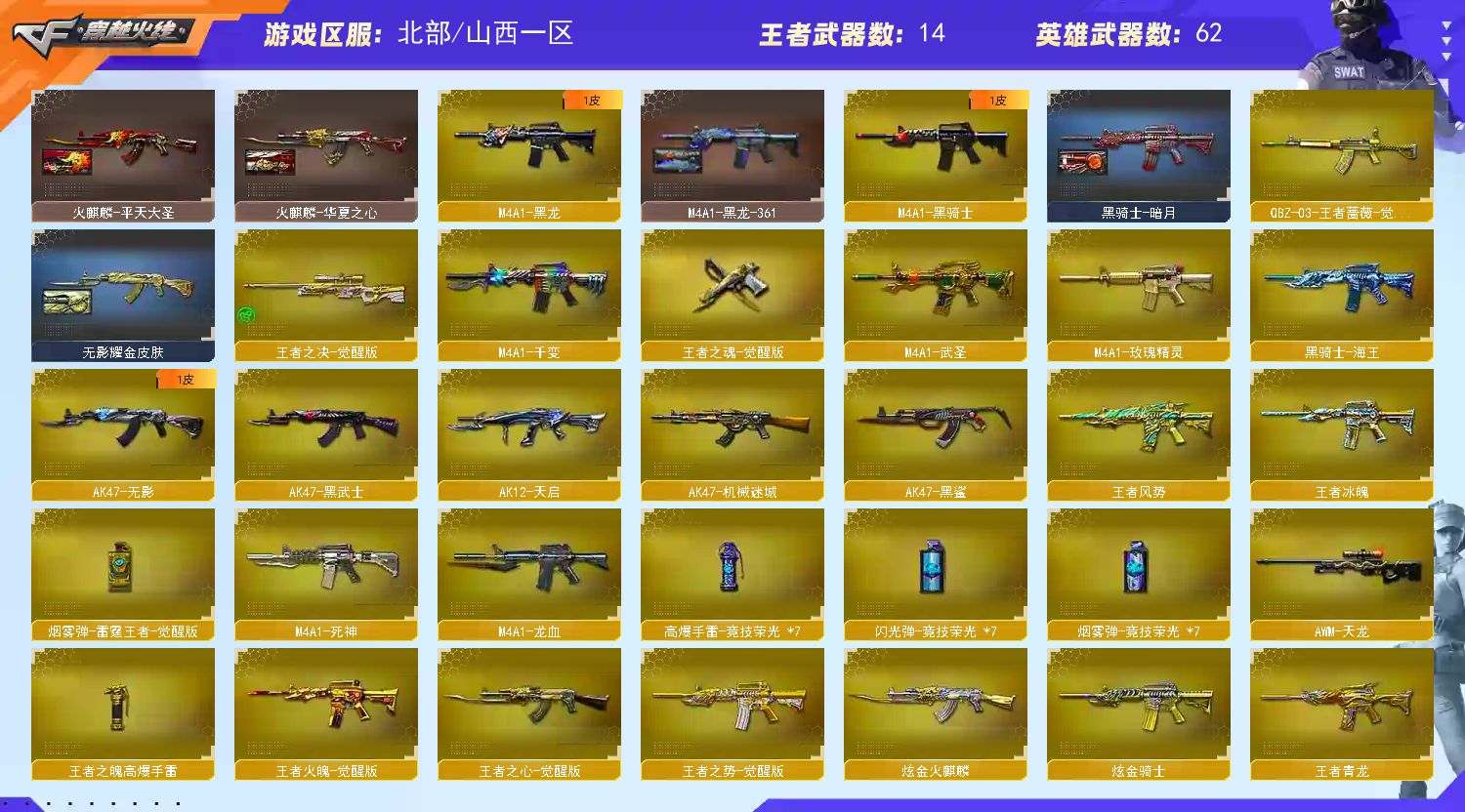 【传说武器!!!】【M200幻神+黄忠皮肤+云悠悠】【98k星神】【传说光耀 传说夜影】【白虎】【qbz03金色蔷薇 qbz03王者蔷薇】【王者之心 王者冰魄 王者风势 王者火魄 王者青龙 王者之势 王者之决】【2盘龙+烈龙】【毁灭+毁灭音效卡】【千变 火麒麟 雷神 黑龙 黑骑士 无影 死神 黑武士 天启 武圣 机械迷城 黑鲨 龙血 源雷神III 玫瑰精灵 9A91烈火 AA12雷霆】——【沙鹰修罗 柯尔特竞技荣光 王者之魂 王者之灵】——【屠龙 龙啸 擎天 麒麟刺 擎天竞技荣光】——【竞技荣光投掷武器套装*7】——【热门武器/小人枪】【M4A1赤狱骑士 AWM昌龙 M4A1青龙 炫金火麒麟 炫金骑士 斯泰尔蝴蝶 死亡之眼】——【角色】【4防(王者瞳闭月羞花 王者魅影)】【云悠悠 关小雨 葵 零 审判者 瞳 樱】;电竞教官-云悠悠,RPK-盘龙,QBZ03-金色蔷薇,M200-幻神,Scar Light-白虎,Kar98K-星神,