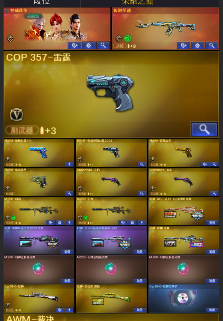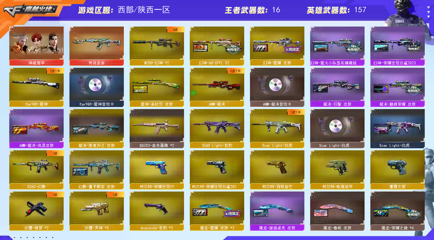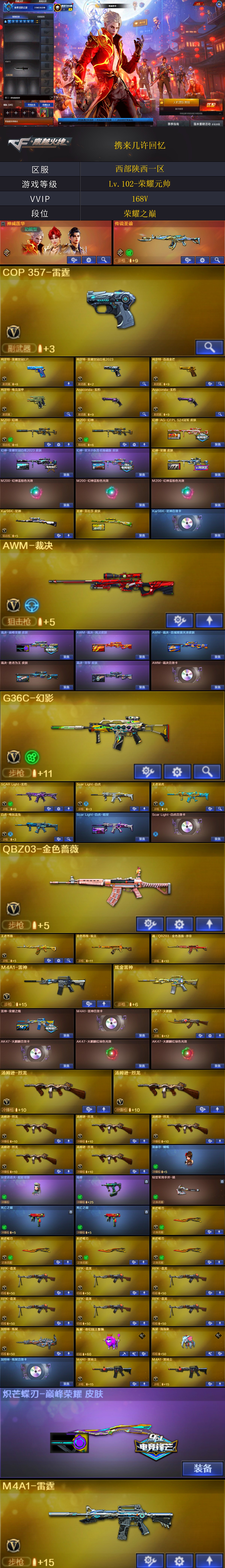 【商品标题】:西部陕西一区-168V-可二次实名-【Lv.102-荣耀元帅】-【段位:荣耀之巅】 【稀有武器】:M200-幻神(2)/Kar98K-星神/G36C-幻影/ScarLight-白虎/M4A1-雷霆/雷霆之契/柯尔特-电竞装甲/天神-动感闪耀/柯尔特-荣耀世冠白鲨2023/修罗-古蛇迷踪/金色蔷薇-古蛇迷踪/QBZ03-金色蔷薇(2)/AK47-火麒麟(3)/M4A1-黑龙(2)/M4A1-雷神(4)/M4A1-黑骑士(2)/AK47-无影/AK47-黑武士/白虎-电玩蓝兔/Barrett-毁灭(2)/Barrett-极光(3)/AWM-裁决/RPK-盘龙(6)/加特林-炼狱/汤姆逊-烈龙(7)/AA-12-雷霆/炽芒蝶刃(4)/擎天-竞技荣光 【王者武器】:王者芳薇-觉醒版/炼狱-悦蓝(2)/王者之心/王者之怒/王者之光/炼狱-悦蓝(2) 【热门角色】:星际战将/炫/隼/乔伊教练/蛇隐宗/王者-魅影/空/兔囡囡/潘多拉 【热门音效卡】:Kar98K-星神音效卡/AWM-裁决音效卡/Scar Light-白虎音效卡/加特林-炼狱音效卡/M4A1-雷神音效卡/Barrett-毁灭音效卡/M4A1-黑骑士音效卡/AK47-火麒麟音效卡/M4A1-黑龙音效卡/Barrett-极光音效卡 【热门皮肤】:幻神-AG-CFPLS24冠军皮肤/幻神-星耀皮肤/幻神-荣耀世冠白鲨2023皮肤/幻神-星火小队签名臻藏版皮肤/裁决-巅峰荣耀皮肤/屠龙-星耀皮肤(2)/星神-美杜莎皮肤/裁决-羽掣皮肤/屠龙-破浪逐光皮肤/炼狱-电子连击皮肤/ScarLight-白虎-暗星/屠龙-荣耀之锋(4)/毁灭-荣耀之怒/屠龙-春桃皮肤/雷神-荣耀之魄 【其他亮点】:斯泰尔-蝴蝶/炼狱-泡泡象/毒蜂/VEPR-12-金魔/贝雷塔687-射手座/烟雾弹-荣耀世冠白鲨2023 (截图展示段位不代表实际段位,如赛季更新等不可抗拒因素发生变化,其余道具看截图或咨询客服);柯尔特-荣耀世冠白鲨2023,炽芒蝶刃,隼,RPK-盘龙,QBZ03-金色蔷薇,G36C-幻影,炼狱-泡泡象,