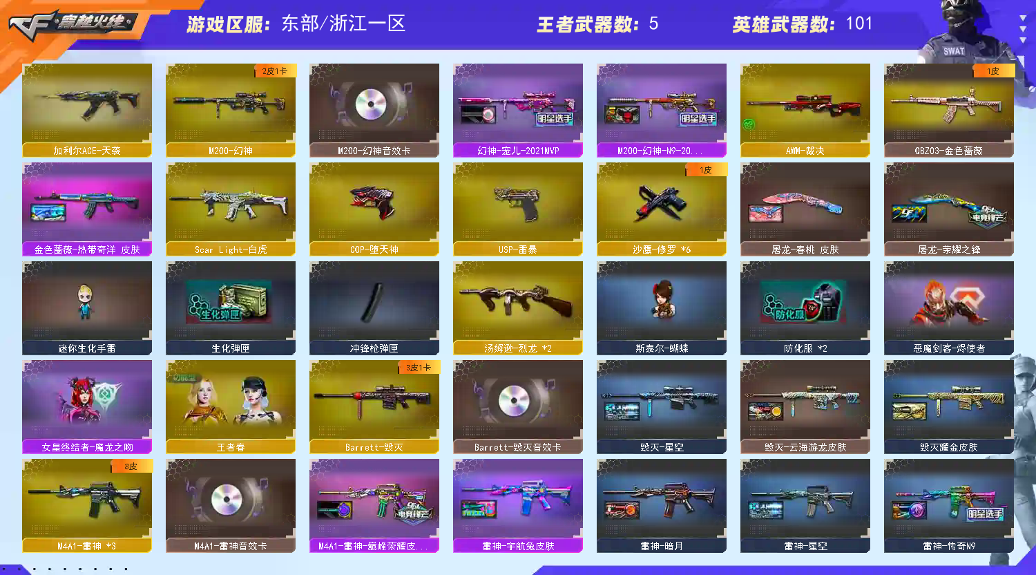 幻神三件套】【M200-幻神+音效卡+幻神-宠儿+幻神-N9】【王者幻神】【ScarLight-白虎】【Barrett-毁灭+音效卡】【加利尔天袭】【AK47-火麒麟】【M4A1-雷神+音效卡+巅峰荣耀+雷神-宠儿+雷神-传奇n9+雷神-荣耀之魄】【黑骑士】【王者之魄 凤吟之魄 王者之怒】【天启】【9手枪 修罗*6 usp雷暴 cop堕天神】【16近战 屠龙*2 龙啸 麒麟刺 斩神刀雷暴*2 】【手雷 雷霆雷 雷暴雷 堕天神 竞技荣光 量子之心 】【四防 王者春】【幻神音效卡 Barrett-毁灭音效卡;USP-雷暴,QBZ03-金色蔷薇,M200-幻神,Scar Light-白虎,加利尔ACE-天袭,