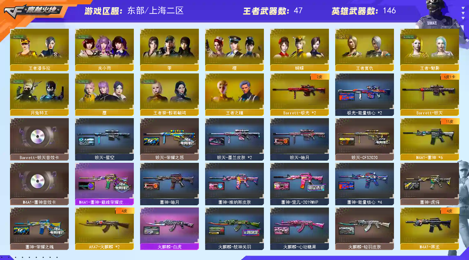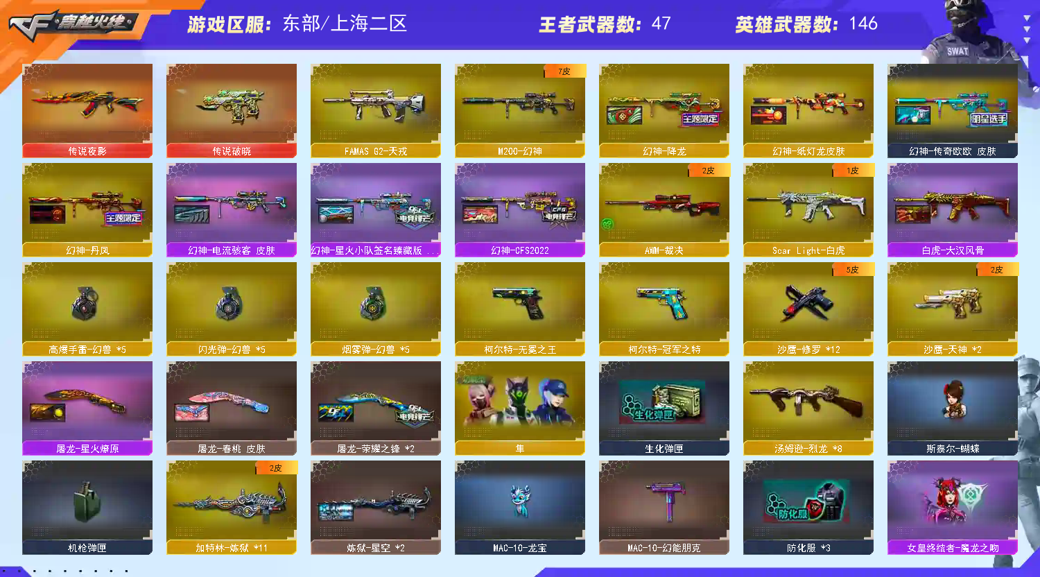 M200-幻神+幻神-传奇欧欧+幻神星火小队+幻神-电流骇客+幻神-纸灯龙+幻神-降龙+幻神-丹凤+幻神-CFS2022】【竞技荣光套】【王者星神】【王者星霆】【传说夜影】【幻兽套+幻兽雷*5】【传说破晓】【ScarLight-白虎】【生化 6炼狱 6烈龙 蝴蝶 死亡之眼】【Barrett-毁灭+音效卡】【天戎】【雷霆套】【AK47-火麒麟】【黑龙】【M4A1-雷神+音效卡】【6黑骑士】【王者之心 王者之魄 王者之幻 王者风吟 王者霜心】【千变 无影 死神 黑武士 天启 机械迷城 玫瑰精灵】【26手枪 修罗*12 天神*2 柯尔特无冕之王 王者之魂 柯尔特-冠军之特 cop王者堕天神】【22近战 屠龙*5 龙啸*3 擎天*2 麒麟刺*4 幻灵之锋 王者之击 王者之刺 】【手雷 雷霆雷 幻灵雷 竞技荣光 雷霆王者 】【四防 王者魅影 王者葵惊若翩鸿 王者潘多拉;柯尔特-无冕之王,柯尔特-冠军之特,隼,M200-幻神,Scar Light-白虎,