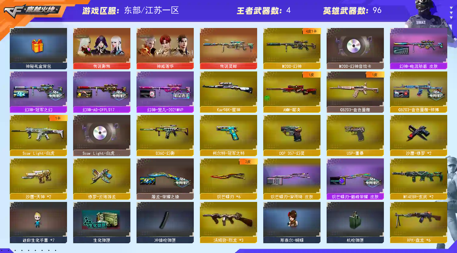 各位老板,上不去号的重启上号器给如有频繁登录,关闭Wegame,重新登录上号器,本账号已经在公安局做了虚以财产登记。若是因为外挂行为导致账号被封。u号zu实ming制的。还有游戏ip登录记录,不管你在哪都能找到你你,最后造成的财产损失,不是你承担就是你家人承担。切勿以身犯法。文明游戏,挂机拉黑 请老板完成对局后再下线.祝老板游戏愉快把把mvp;USP-雷暴,柯尔特-冠军之特,炽芒蝶刃,传说影煞,RPK-盘龙,QBZ03-金色蔷薇,G36C-幻影,
