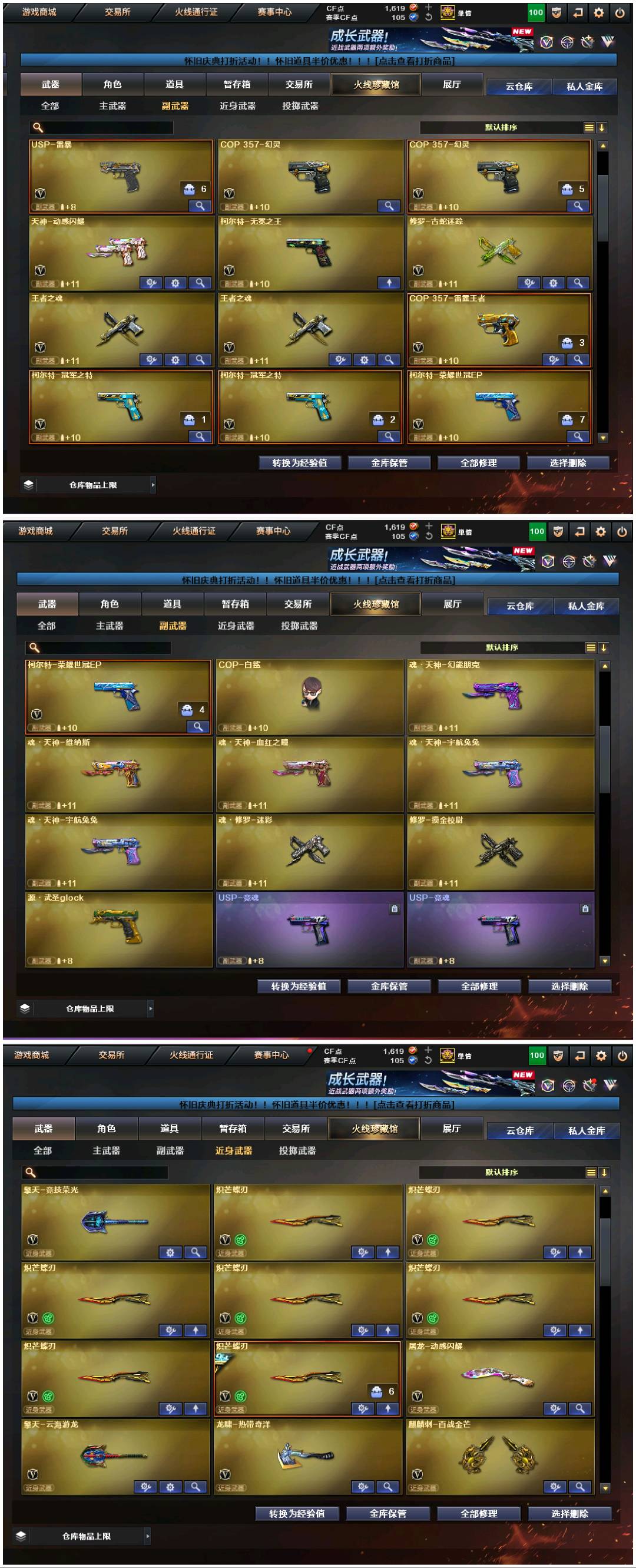 九把副武器 幻神三件套ep+kz+冠军之幻+宠儿+yzk 裁决三件套叶子+过载+流光秘银 星神三件套+冠军之星+巅峰荣耀 白虎三件套+光海夜岚+冠军之虎 qbz冠军之薇+ep 极光三件套 毁灭三件套 七把蝴蝶刀 ep小刀;