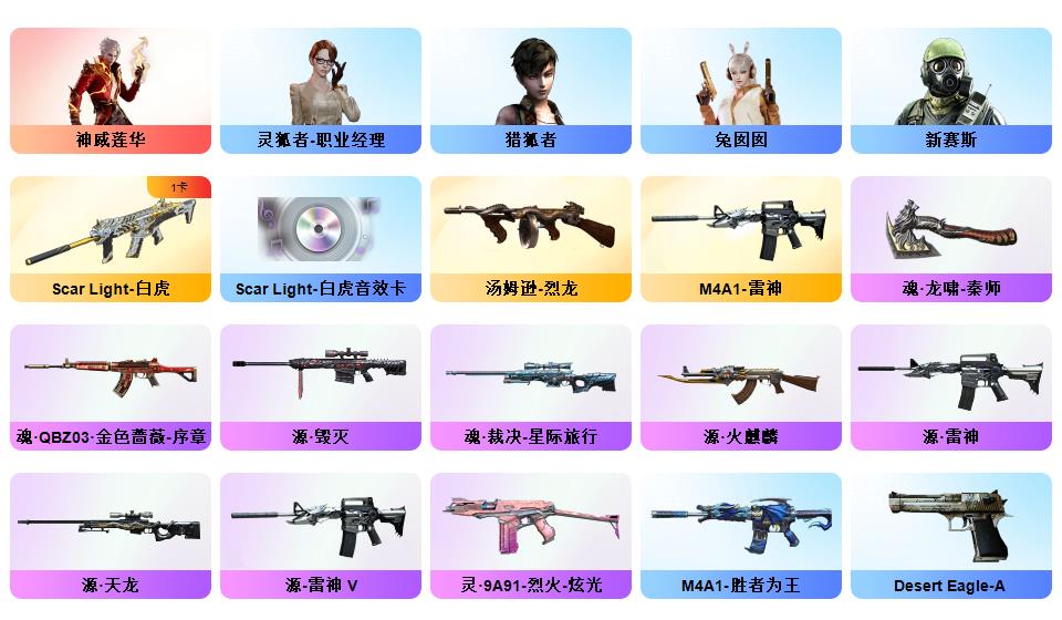 【穿越火线】湖南一区,神威莲华,Scar Light-白虎,汤姆逊-烈龙*6,Scar Light-白虎音效卡,4防灵狐者-职业经理,兔囡囡,迷你生化手雷,Scar Light-白虎,汤姆逊-烈龙*6,源·火麒麟*2,源·雷神,源·天龙,源·毁灭,魂·龙啸-秦师*2
