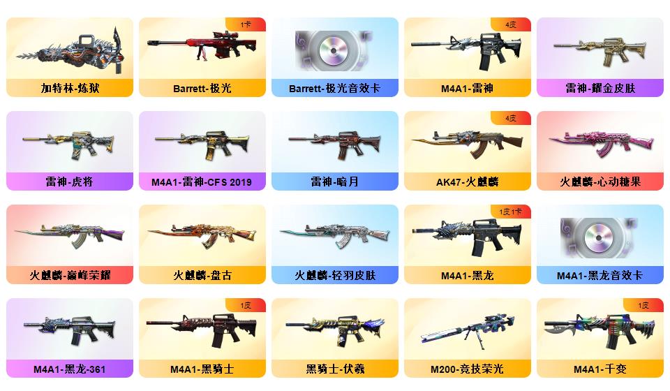 【穿越火线】上海二区 ,竞技荣光套装/荣耀世冠套装/雷暴套装,_M200-幻神/M200-竞技荣光/Barrett-毁灭(2)/斯泰尔-蝴蝶/Barrett-极光/Kar98K-星神/AWM-天龙(7)/AWM-裁决/M4A1-雷神(4)/荣耀世冠-雷神/M4A1-黑龙/M4A1-龙血(2)/M4A1-千变(4)/M4A1-黑骑士(2)/M4A1-玫瑰精灵/王者之武-觉醒版/王者冰魄-觉醒版/AK12-天启(3)/AK47-火麒麟(4)/王者炎心-觉醒版