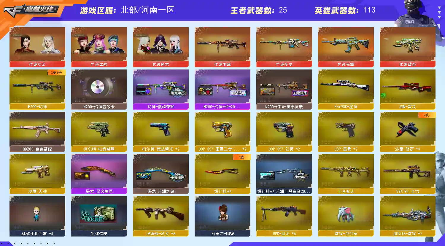 幻神三件套 生化六盘六烈六炼狱+蝴蝶+泡泡象】【四防传说女帝】【四防传说影煞】【传说星骇】【传说幽瞳】【M200-幻神+音效卡+幻神-N9+幻神-巅峰荣耀+幻神-黄忠】【竞技荣光套+四防云悠悠+usp雷暴】【Kar98K-星神】【王者幻神】【传说圣灵】【传说光耀】【QBZ03-金色蔷薇】【生化 6盘龙 6炼狱 6烈龙 泡泡象 蝴蝶 死亡之眼】【传说破晓】【裁决】【Barrett-毁灭+音效卡】【vsk金蚀】【雷暴套】【AK47-火麒麟+音效卡】【黑龙】【M4A1-雷神+雷神-荣耀之魄】【黑骑士】【王者之戮 王者冰魄 王者火魄 王者玄武 王者之怒 王者之光 王者之决】【无影 死神 超新星 黑鲨 龙血 hk417-朱雀 天罚+音效卡】【14手枪 修罗*3 天神 usp雷暴*2 cop幻灵*2 竞技荣光*2 cop雷霆王者*2】【26近战 屠龙 龙啸*13 擎天 斩神刀雷暴 幻灵之锋*3 炽芒蝶刃蝴蝶刀 云龙扇 王者之锋 王者之击 王者之刺 王者冰锋】【手雷 雷暴雷 电竞装甲 竞技荣光 雷霆王者】【四防 雨墨 王者春 王者瞳闭月羞花 王者魅影 王者沙漠玫瑰】【幻神音效卡 Barrett-毁灭音效卡;USP-雷暴,炽芒蝶刃,传说影煞,传说星骇,传说女帝,电竞教官-云悠悠,王者沙漠玫瑰,