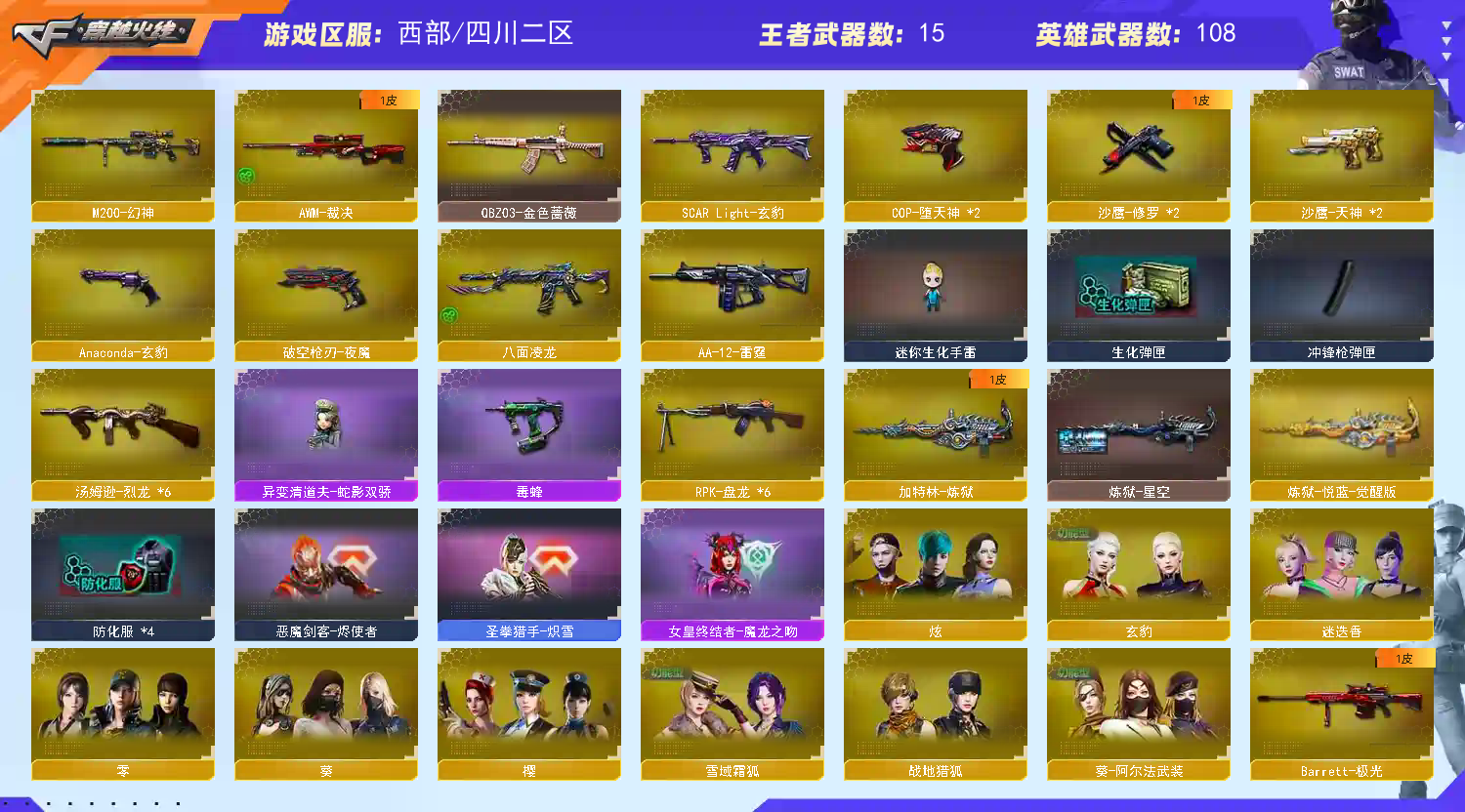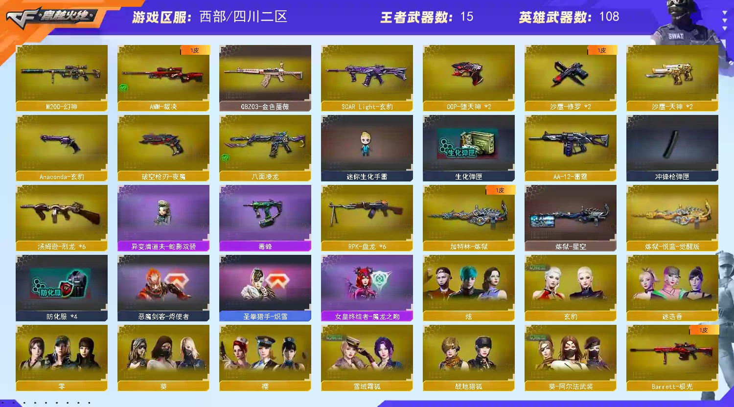 首页 > 租号大厅 > 穿越火线 > 西部/四川二区 > 八面玲珑/六盘六烈/玄豹套➕角色/异变清道夫-蛇影/毒蜂/幻神/夜魔套/火麒麟音效卡/毁灭音效卡