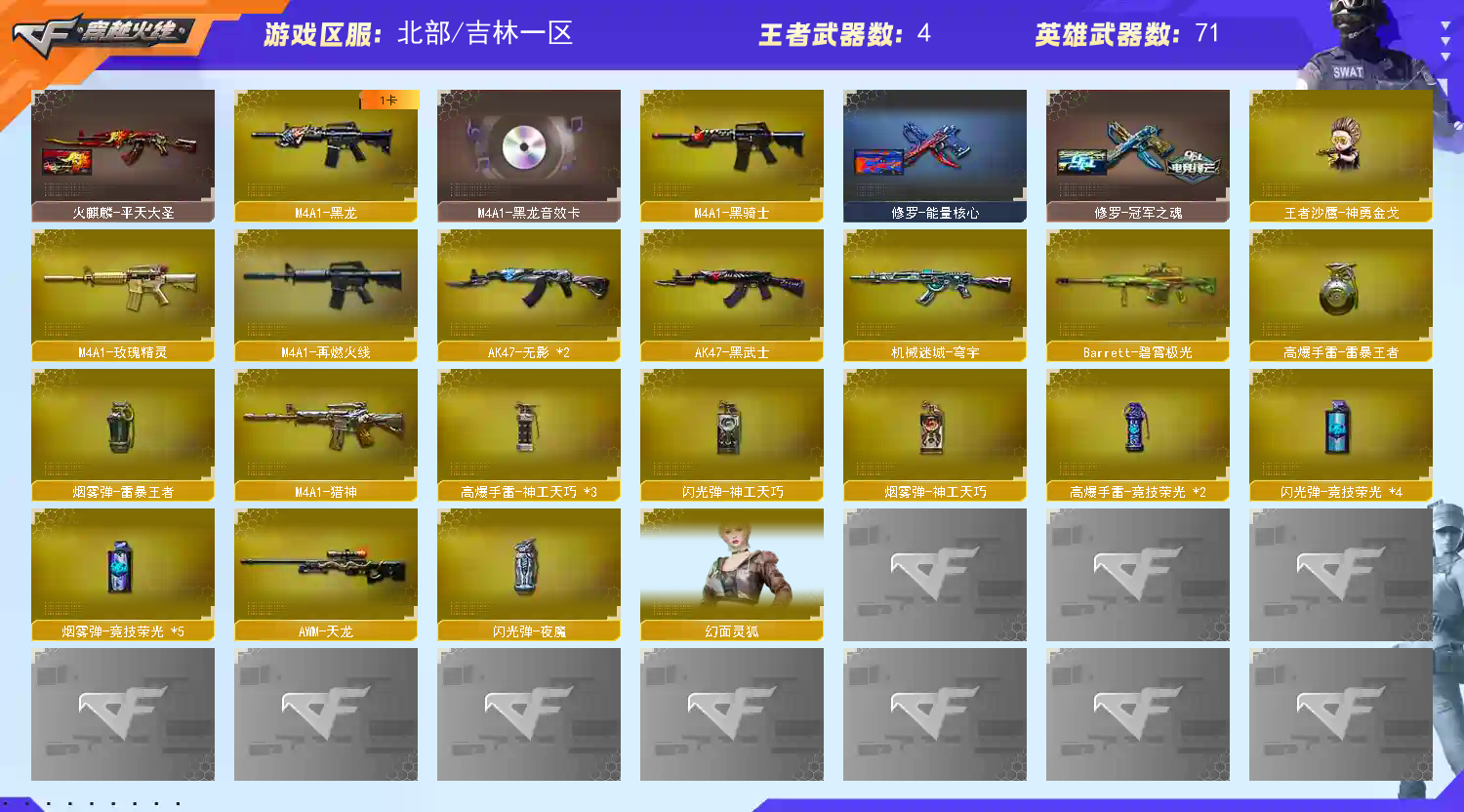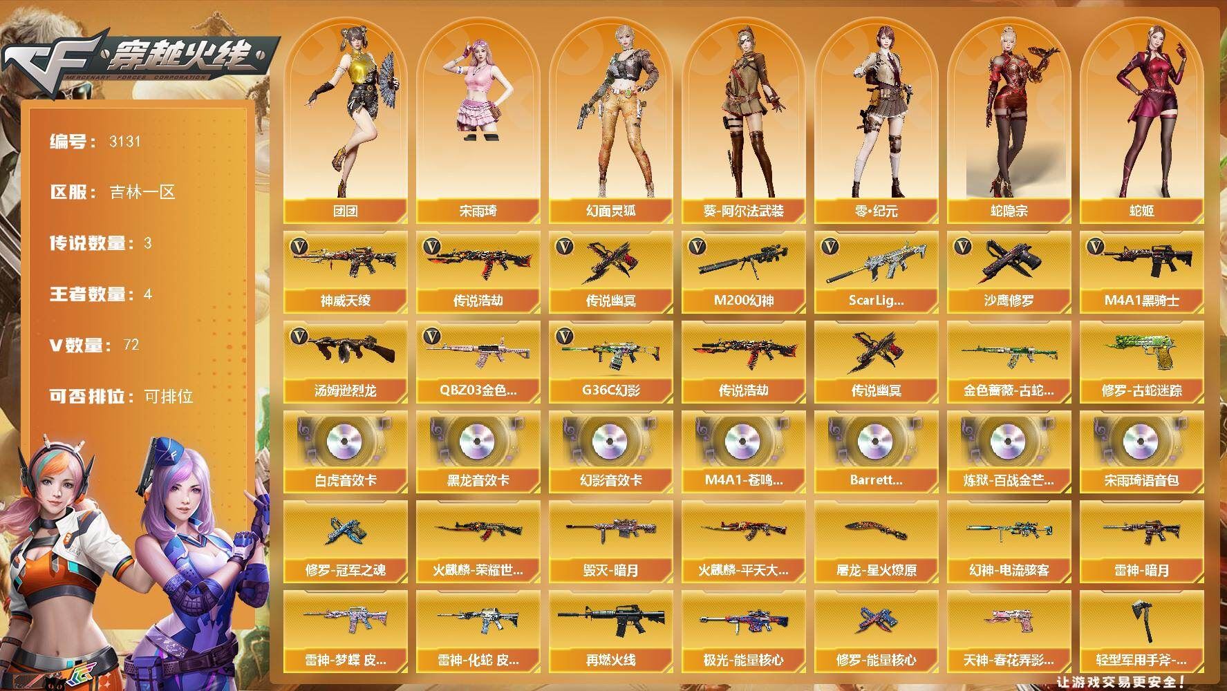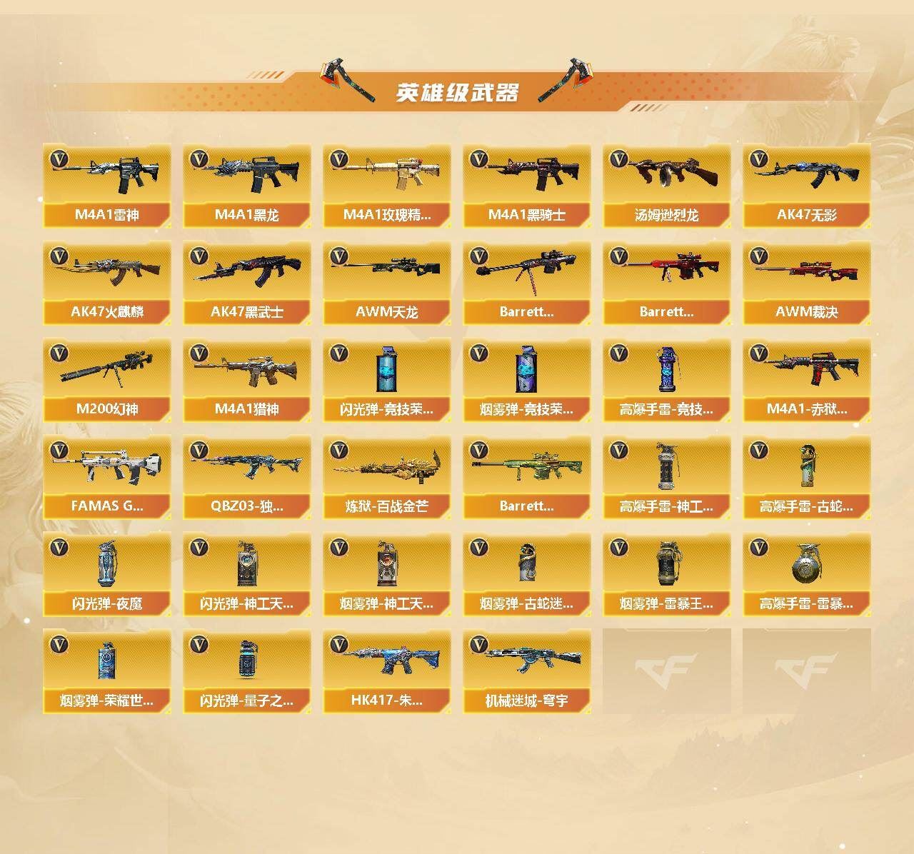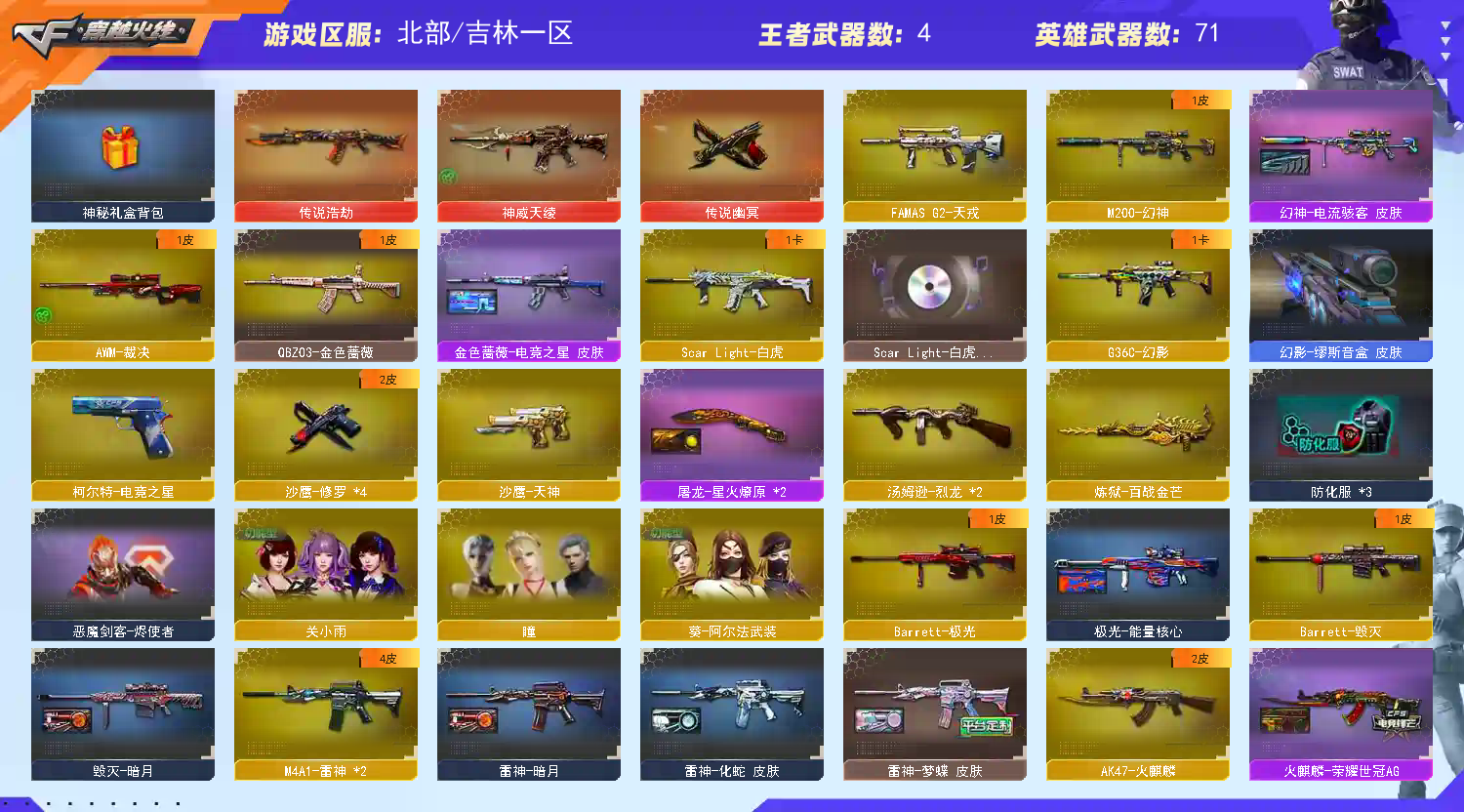 传说武器】:神威天绫,传说浩劫,传说幽冥【热门武器】:传说浩劫,传说幽冥,G36C-幻影,QBZ03-金色蔷薇,Scar Light-白虎,M200-幻神,金色蔷薇-古蛇迷踪,修罗-古蛇迷踪,M4A1-黑骑士,汤姆逊-烈龙*2,沙鹰-修罗*4【音效卡】:M4A1-黑龙音效卡,Scar Light-白虎音效卡,G36C-幻影音效卡,宋雨琦语音包,M4A1-苍鸣雷神音效卡,Barrett-碧霄极光音效卡,炼狱-百战金芒-庆典舞曲音效卡【皮肤】:幻神-电流骇客 皮肤,金色蔷薇-电竞之星 皮肤,裁决-星际旅行 皮肤,雷神-暗月,雷神-梦蝶 皮肤,雷神-化蛇 皮肤,M4A1-再燃火线,火麒麟-平天大圣,火麒麟-荣耀世冠AG,毁灭-暗月,HK417-朱雀-掌火灵橙 皮肤,幻影-缪斯音盒 皮肤,极光-能量核心,修罗-能量核心,修罗-冠军之魂,天神-春花弄影 皮肤,屠龙-星火燎原*2,轻型军用手斧-再燃火线,擎天-梅雀衔霜 皮肤,炽芒蝶刃-宋雨琦 皮肤【角色】:瞳,4防关小雨,零·纪元,蛇隐宗,乔伊教练,修道士,葵-阿尔法武装,幻面灵狐,4防宋雨琦,空,芳心审判者,娟娟,灵狐-花神,曼陀罗-X,玫瑰花神,潘多拉-X,蛇姬,蜀雪,铁骑荣耀,兔囡囡,雪莉杨-摸金校尉,影武者-X,团团【人偶武器】:王者沙鹰-神勇金戈,AWM-灵狐-15周年嘉年华【英雄级武器】:AK47-火麒麟,M4A1-黑龙,M4A1-雷神*2,M4A1-黑骑士,AK47-无影*2,AK47-黑武士,Scar Light-白虎,G36C-幻影,金色蔷薇-古蛇迷踪,FAMAS G2-天戎,QBZ03-独角-IV,M4A1-玫瑰精灵,QBZ03-金色蔷薇,M4A1-猎神,HK417-朱雀-电竞之星,机械迷城-穹宇,天罚-斗烈龙驹,AWM-天龙,Barrett-毁灭,Barrett-极光,AWM-裁决,M200-幻神,炼狱-百战金芒,汤姆逊-烈龙*2,沙鹰-修罗*4,沙鹰-天神,柯尔特-电竞之星,修罗-古蛇迷踪,屠龙*2,擎天*2,麒麟刺,擎天-竞技荣光,麒麟刺-百战金芒,屠龙-电竞之星,屠龙-斗烈龙驹,龙啸-烈火龙威,高爆手雷-竞技荣光*2,高爆手雷-神工天巧*3,高爆手雷-古蛇迷踪,高爆手雷-雷暴王者,闪光弹-夜魔,闪光弹-竞技荣光*4,闪光弹-神工天巧,闪光弹-量子之心,烟雾弹-竞技荣光*5,烟雾弹-神工天巧,烟雾弹-古蛇迷踪,烟雾弹-雷暴王者,烟雾弹-荣耀世冠EP,M4A1-赤狱骑士,AK47-竞魂无影,Barrett-碧霄极光【源级武器】:魂·雷神-神秘按键,魂·雷神-新春神龙*2,M4A1-青龙-掌上穿越火线,魂·QBZ03-金色蔷薇-古蛇迷踪,魂·9A91·烈火-电子连击,灵·Barrett-金色蔷薇-甜蜜火力,魂·Barrett-朱雀-锦鲤,魂·Barrett-朱雀- 新春神龙,灵·Barrett-朱雀-炫光*2,魂·炼狱-玩具枪,魂·炼狱-月,魂·修罗-迷彩,魂·修罗-现代金属,魂·天神-宇航兔兔,魂·龙啸-NICE,魂·龙啸-秦师【道具】:宋雨琦炫彩背包,神秘礼盒背包,BS战队炫彩背包,EP战队炫彩背包,云山科技背包,亚洲杯纪念炫彩背包,炫彩背包-诺拉,炫彩背包,救世主-黑桃战神,灵魂忍者,迷雾幽灵,夺命之镰,防化服*3,流光-鎏金之域,流光-再燃火线,枪王排位29赛季金色流光,语音特效-盛典烟火,古蛇迷踪特效,蛇隐宗表情,萌萌小葵表情,防弹头盔,防弹衣,C4工具钳,手雷包【特殊枪械】:1白虎,1黑骑士,2烈龙,;传说幽冥,QBZ03-金色蔷薇,G36C-幻影,M200-幻神,Scar Light-白虎,传说浩劫,