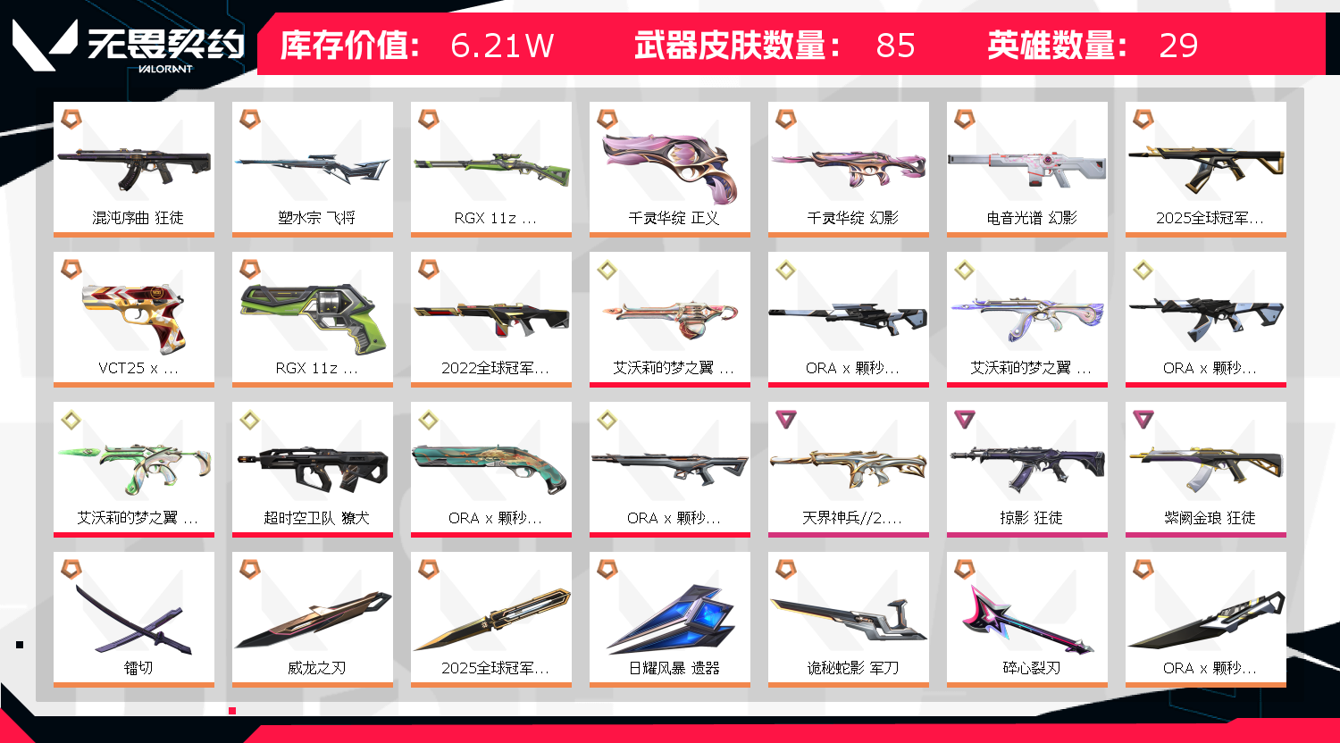 可排,全英雄, 6万库存,⭐️22套25套,⭐️VCT26⭐️,及热门皮肤,🈲开挂挂机,超凡挂坠