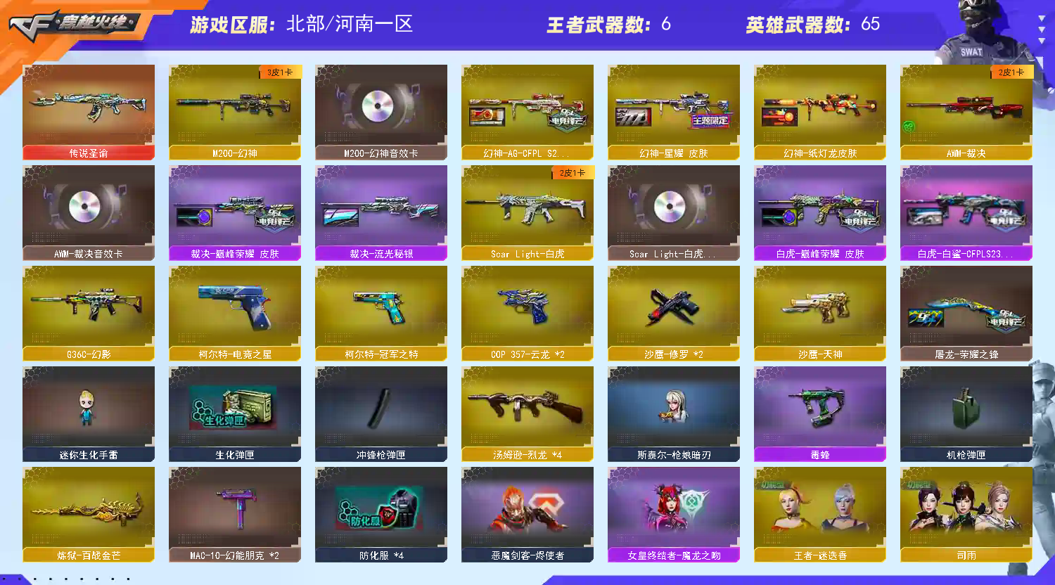 【🈲止使用鼠标宏,DMA,外挂进行游戏,造成损失后果自负!!!】 【订单时间快到了🈲止再开排位赛,导致账号禁赛的租客将被永久拉黑!】 本账号经过网络财产备案,一经发现直接报警处理立案追责,根据账号价值全额赔偿感谢支持谢谢合作谢谢合作!!!!禁止利用账号进行开挂、使用辅助违规软件诈骗等违规操作!;柯尔特-冠军之特,晴雅,G36C-幻影,M200-幻神,Scar Light-白虎,传说圣谕,
