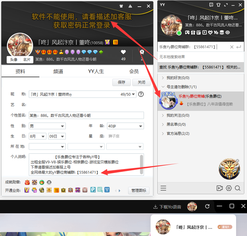 上号请加.Q.q.群(5586.1471)手机也可正常上号✿登录不上去的老板✿找工作室客.服协助上号歪歪商务-欢迎各位来租号,最近封号狗太多 即日起 本店号码 本店股东租V9-v8-爵位-虎牙-抖音-请下单找管理员协助上号,协助手机,登录,恶意投诉者拉黑处理!玩相亲模板的老板 看图拿号,【价格是商铺会员价,普通客户租号请找商铺拿号单原价租用YY账号 】租号老板请注意--- 歪歪专用上号器下载址:sh.qybug.com  我们会给您补时15分钟,给您带来不便请谅解✿如果需要手机上请找商铺拿账号密码上号 ✿ 妹纸租号不容易 各位大哥多多支持各种撩妹号!文明租号 马甲可以随便上 其他勿动! 小女子谢过各位老板支持!撩妹神助力 装B撩妹必选!老租户一律低价畅玩 绝不涨价!如果违反了以上条款中任意一条 号主 则有权利 强制登陆 修改帐号密码