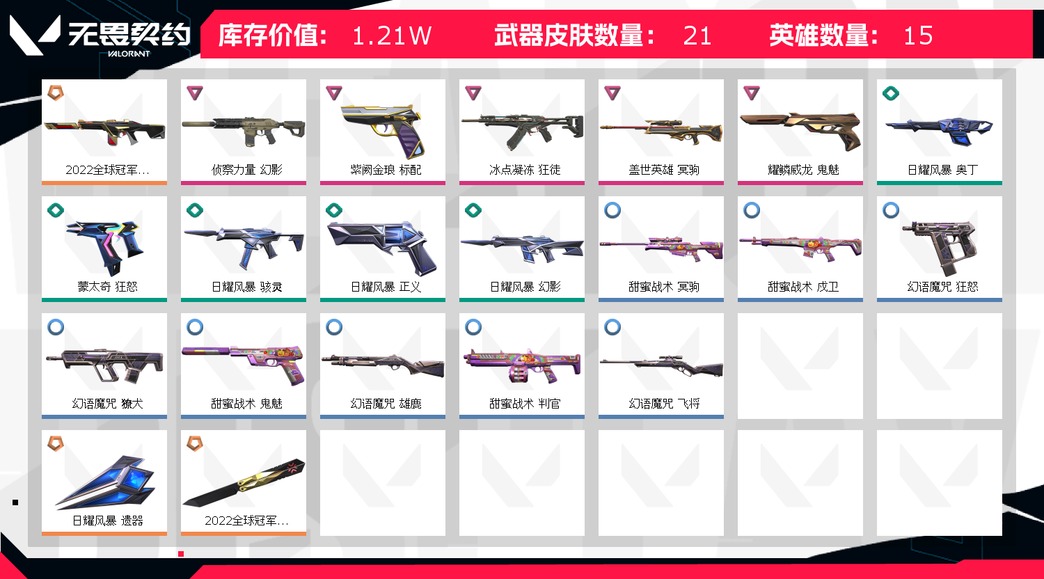 "亮点皮肤(2) 幻影-2022全球冠军赛,*-2022全球冠军赛 近战武器皮肤(1) 日耀风暴 *皮肤(2) 幻影-侦察力量,狂徒-冰点凝冻 佩枪皮肤(2) 标配-紫阙金琅,鬼魅-耀鳞威龙 *皮肤(1) 冥驹-盖世英雄";侦察力量 幻影,紫阙金琅 标配,